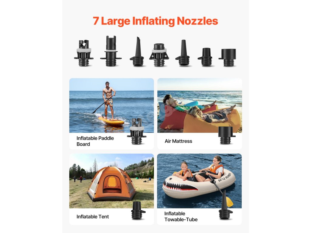 7 trysek pro všechny typy ventilů! SUPy, kajaky, nafukovací matrace, plováky do bazénu a dokonce i na opravu propíchnutého volejbalového míče vašeho kamaráda! S touto pumpou se stanete plážovou verzí "MacGyvera".