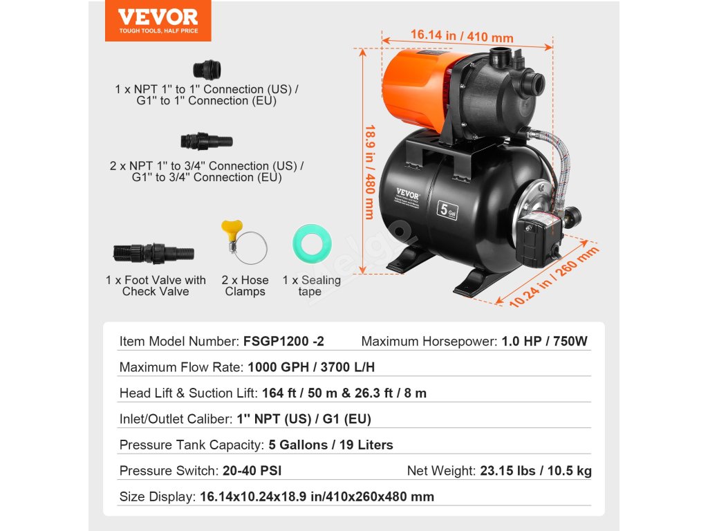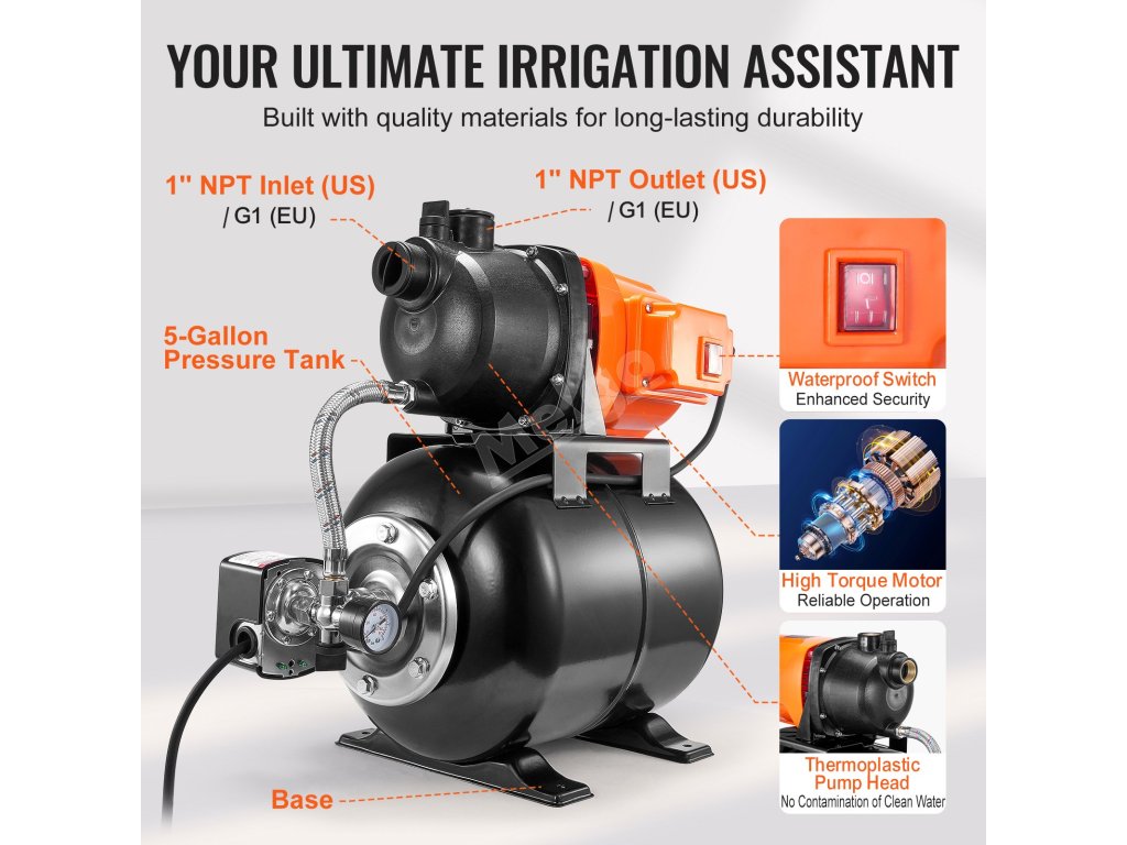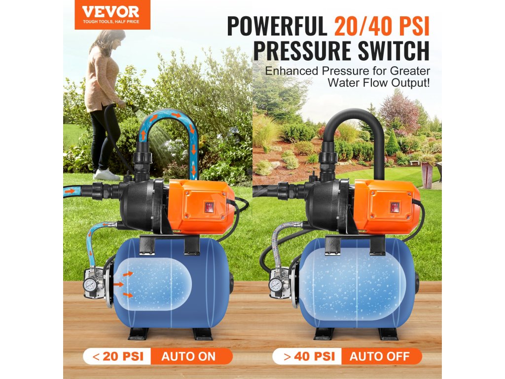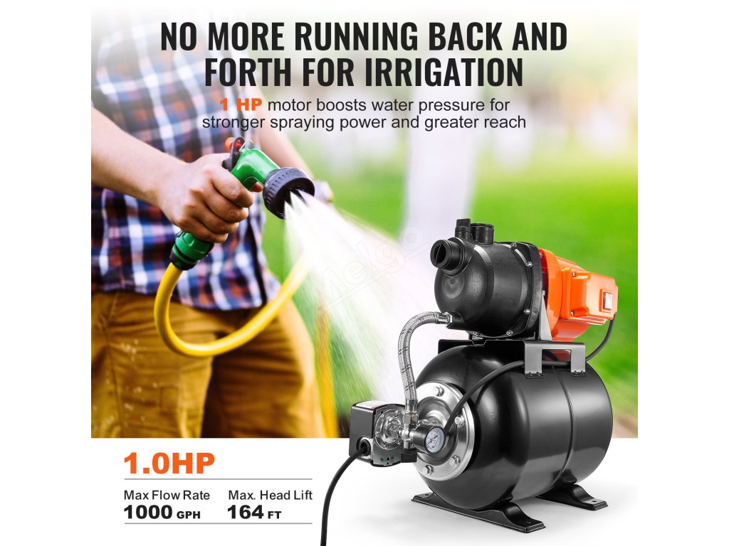 Toto čerpadlo do mělkých studní s tlakovou nádrží, které se může pochlubit maximálním výkonem 50 m a průtokem 3700 l/H (1000 GPH), účinně zvládá dopravu vody na dlouhé vzdálenosti. Jeho působivá schopnost sacího zdvihu 26,3 ft (8 m) umožňuje čerpání vody z hlubších studní nebo pramenů.