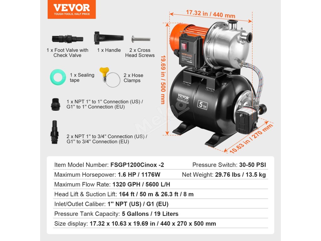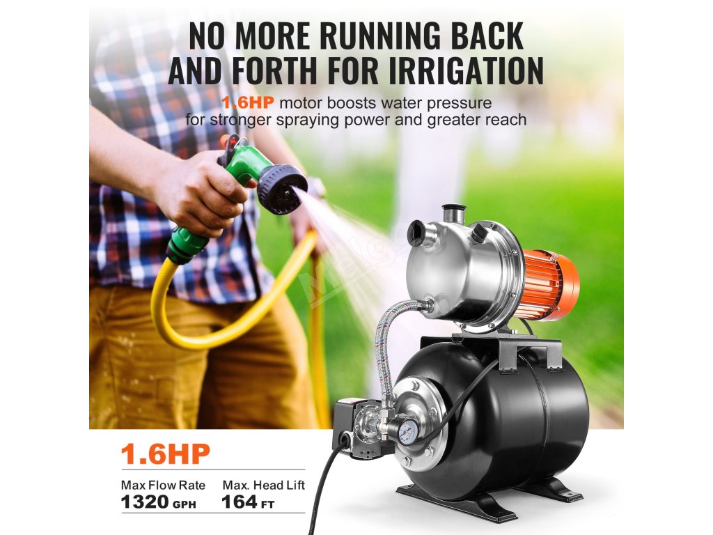 Objevte dokonalé řešení zásobování vodou s naším čerpadlem do mělkých studní o výkonu 1,6 HP! Díky tlakovému spínači 30/50 PSI, maximálnímu průtoku 1320 GPH, maximální výšce 164 stop, zpětnému ventilu a sadě pro připojení zahradní hadice je toto čerpadlo připraveno k provozu ihned po vybalení z krabice a je ideální pro přepravu vody na velké vzdálenosti!
