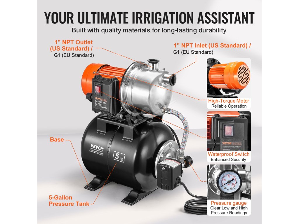 Ideální pro zavlažování v zemědělství, zásobování domácností vodou, průmyslové využití a komerční systémy. Naše čerpadlo pro zvýšení tlaku vody s tlakovou nádrží se vyznačuje stabilním tlakem a průtokem, takže je ideální pro efektivní zavlažování, zajišťuje rovnoměrné zavlažování plodin a spolehlivé zásobování vodou pro různé potřeby.