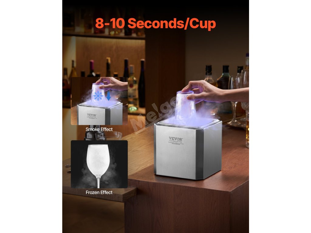 Chladiaci prístroj na sklo využíva funkciu chladenia suchým ľadom, ktorá v krátkom čase ochladí pohár na nízku teplotu.