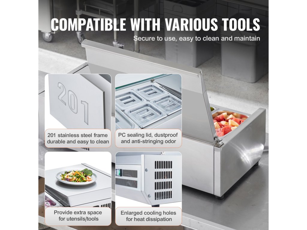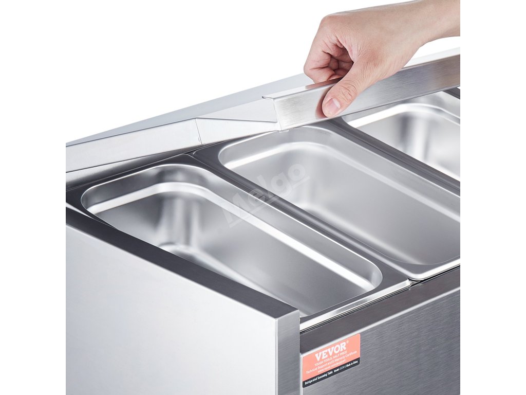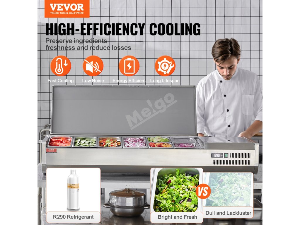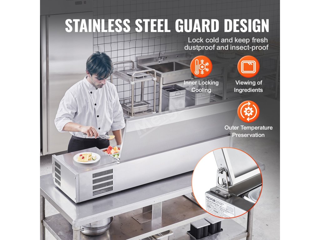 Trápí vás tyto problémy - obtížné udržování čerstvosti surovin, neúplné vystavení surovin a náročné čištění a údržba? Pultová chladicí stanice na přípravu koření VEVOR, určená pro komerční použití, optimalizuje uspořádání prostoru pro skladování různých čerstvých ingrediencí.