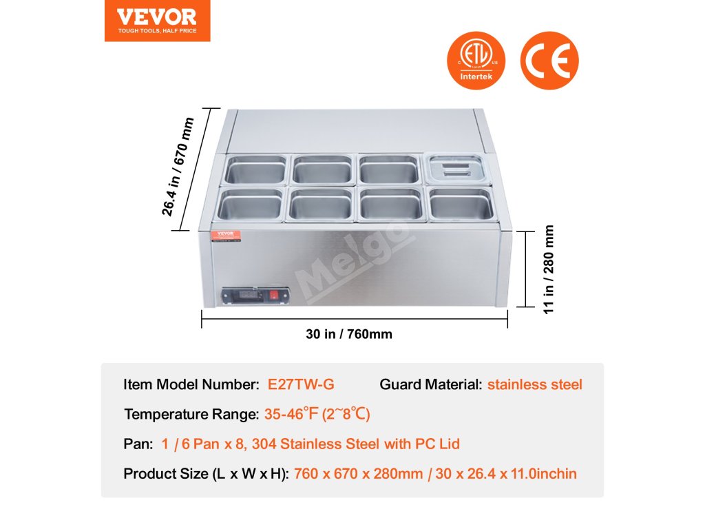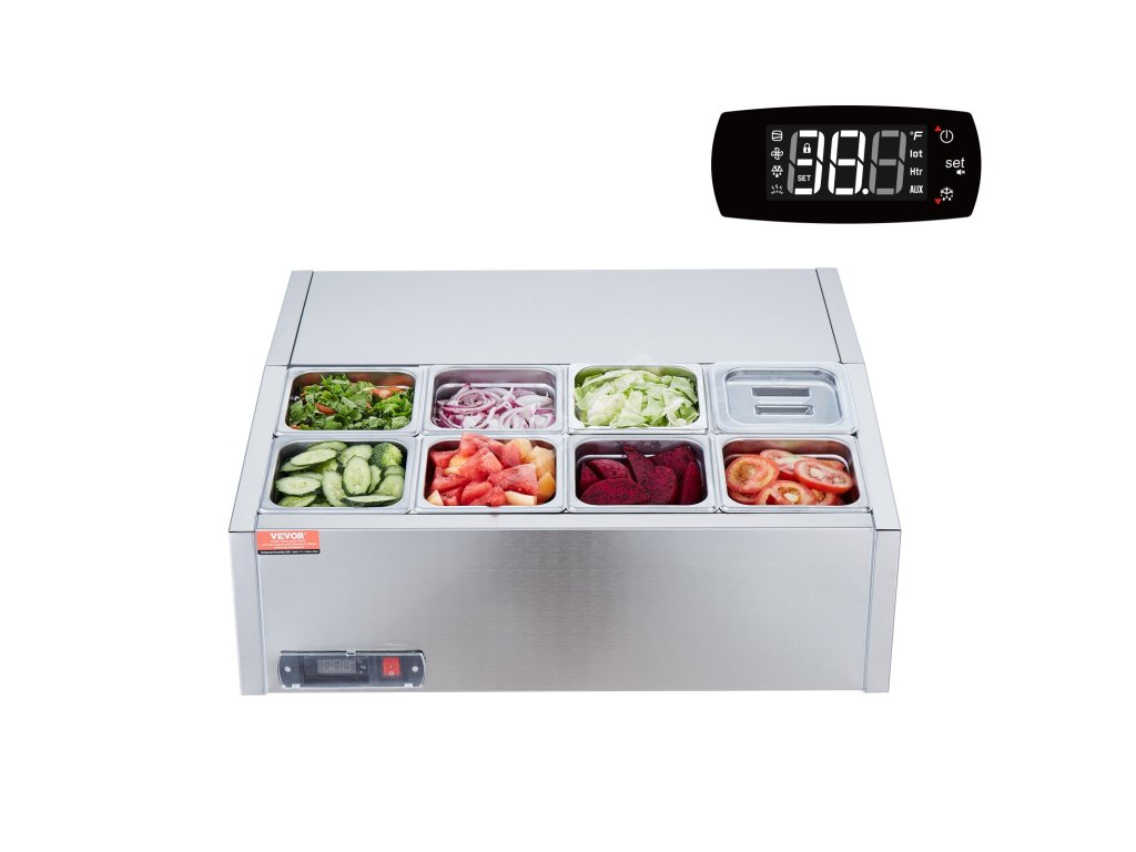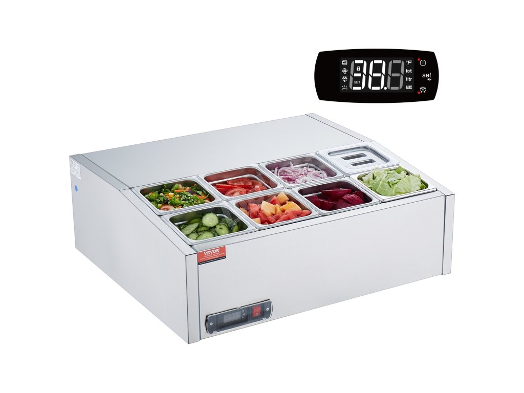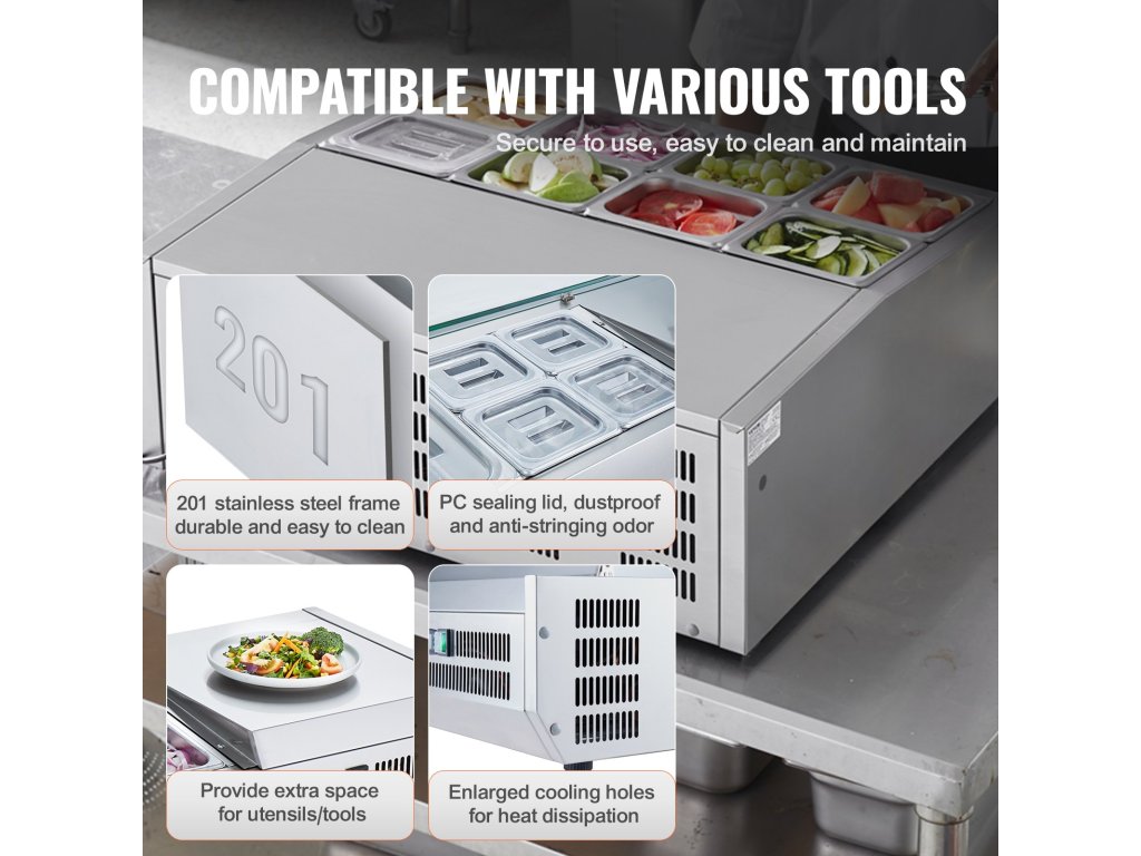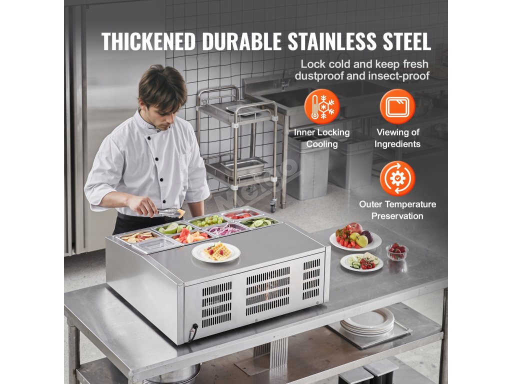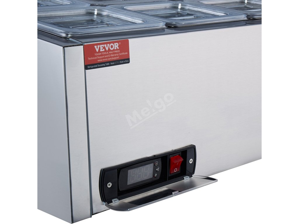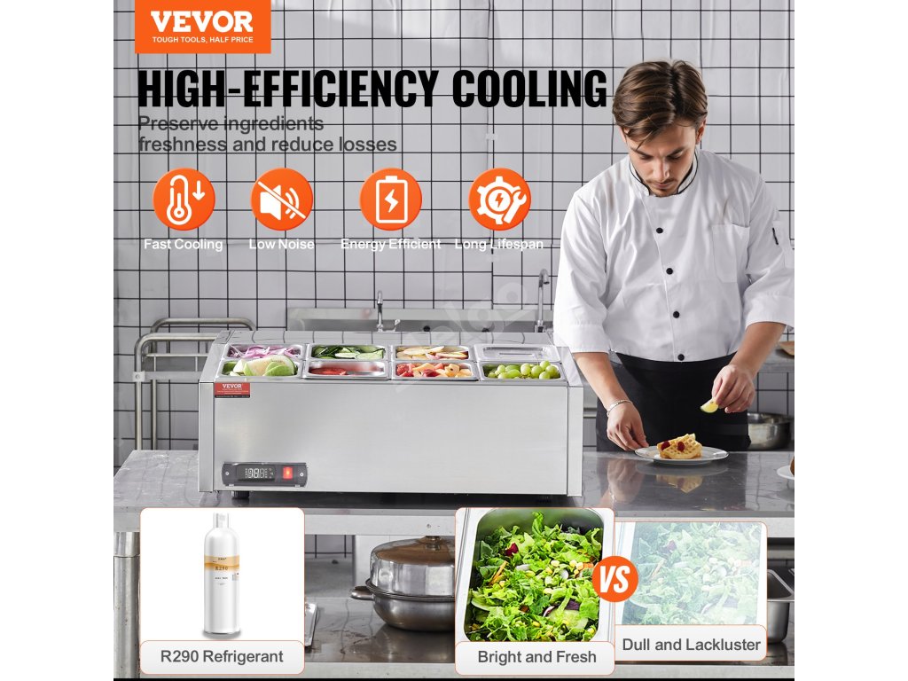 Trápí vás tyto problémy - obtížné udržování čerstvosti surovin, neúplné vystavení surovin a náročné čištění a údržba? Pultová chladicí stanice na přípravu koření VEVOR, určená pro komerční použití, optimalizuje uspořádání prostoru pro skladování různých čerstvých ingrediencí.