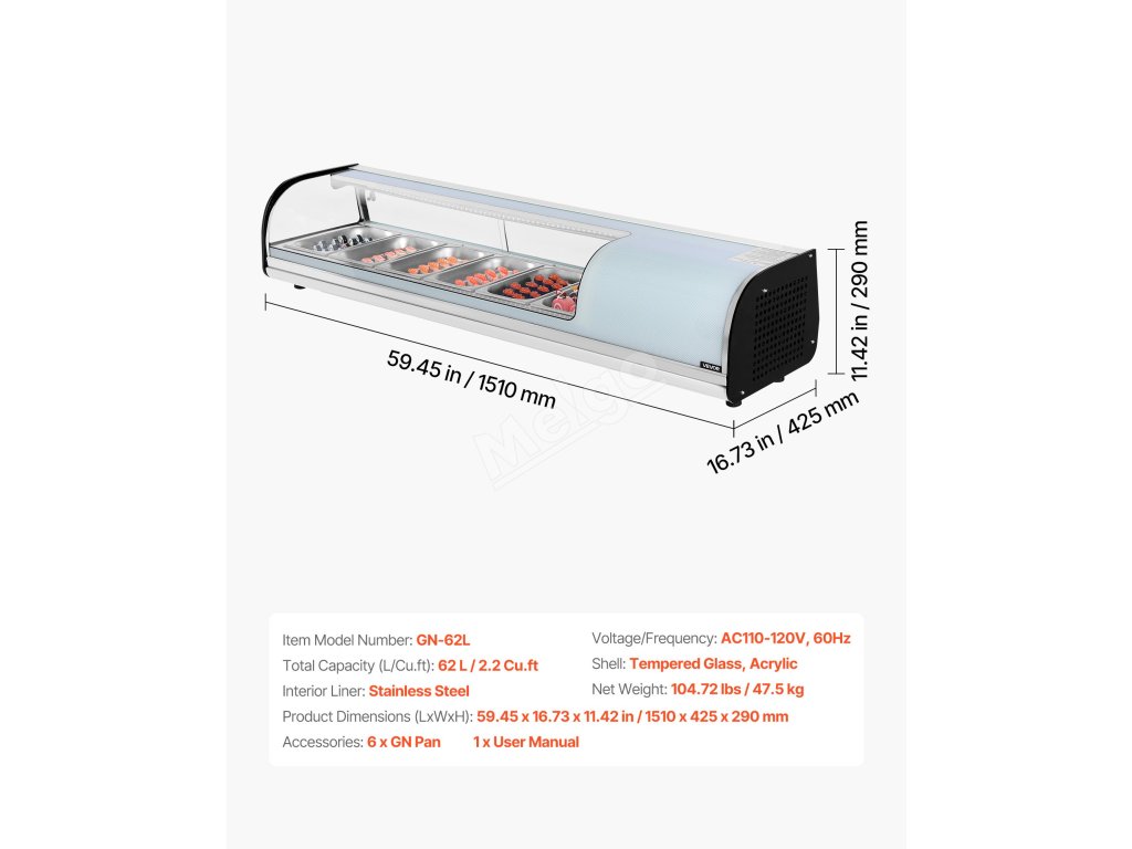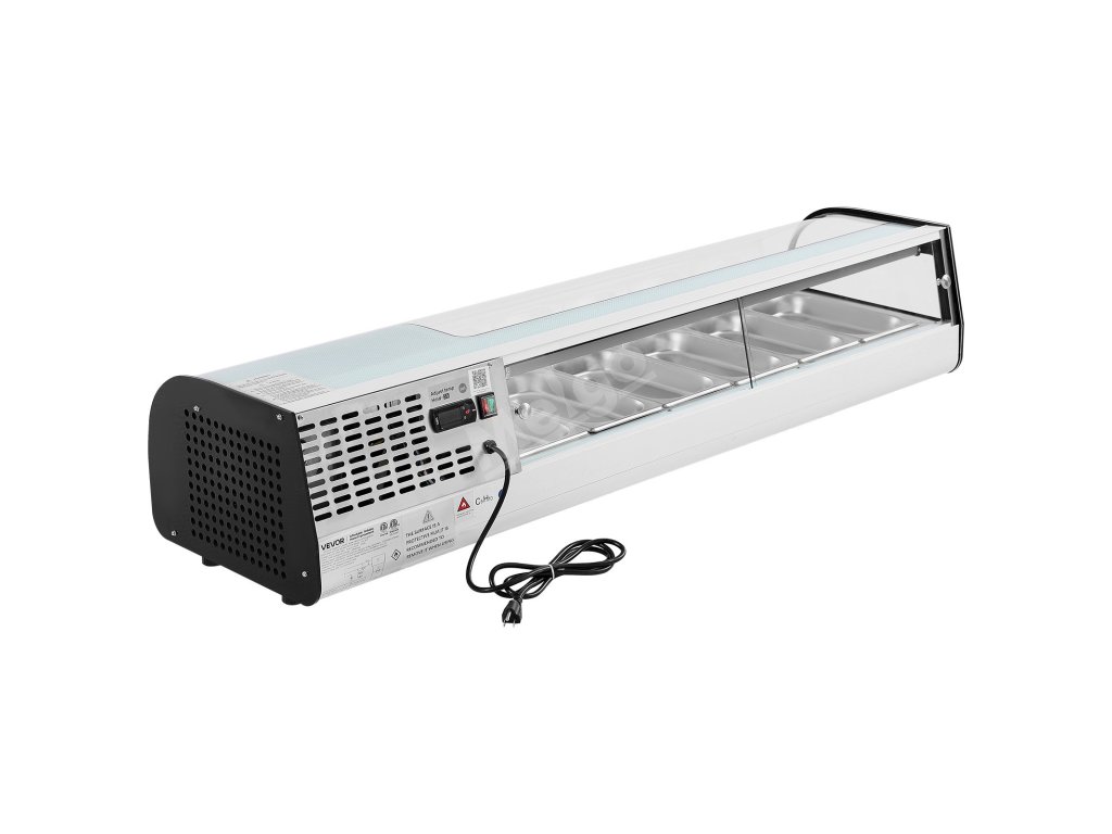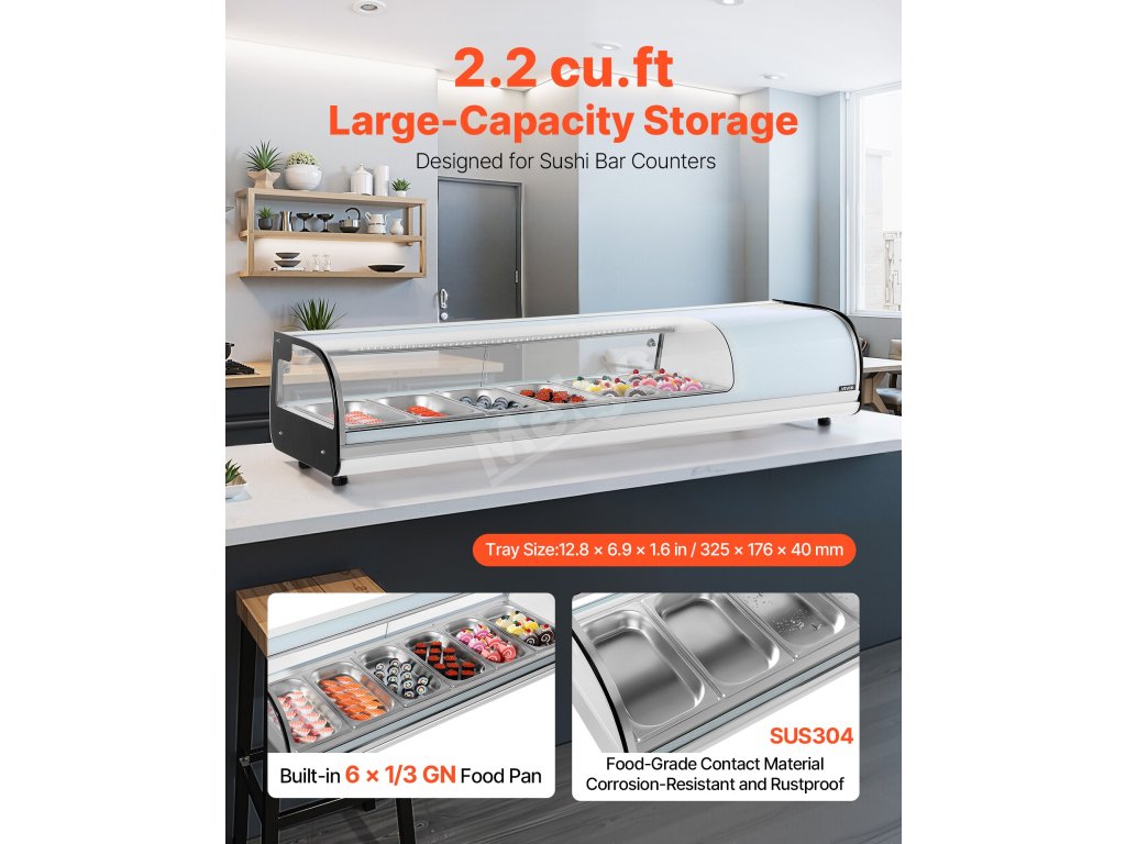 Tato vitrína na sushi nabízí 62 l prostoru s 6 pánvemi z nerezové oceli o objemu 1/3 GN, regulací teploty 35,6-46,4 ℃ (2-8 ℃), zakřiveným tvrzeným sklem a LED osvětlením pro přehledné zobrazení a posuvnými dveřmi pro snadný přístup do sushi barů, obchodů a supermarketů.