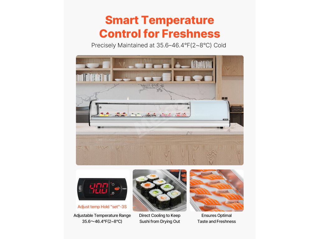 Chladnička na sushi je vybavena digitálním termostatem v zadní části a udržuje teplotu v rozmezí 35,6-46,4℉ (2-8 ℃). Vysoce výkonný kompresor rychle ochlazuje obsah, čímž zajišťuje optimální konzervaci a dlouhodobé komerční využití.