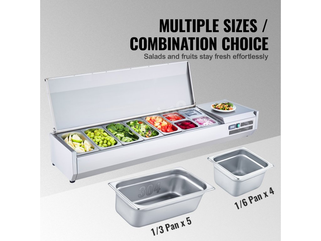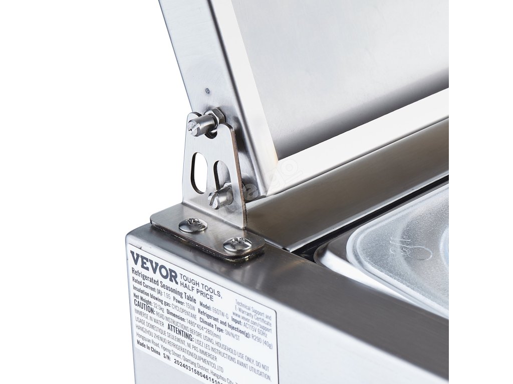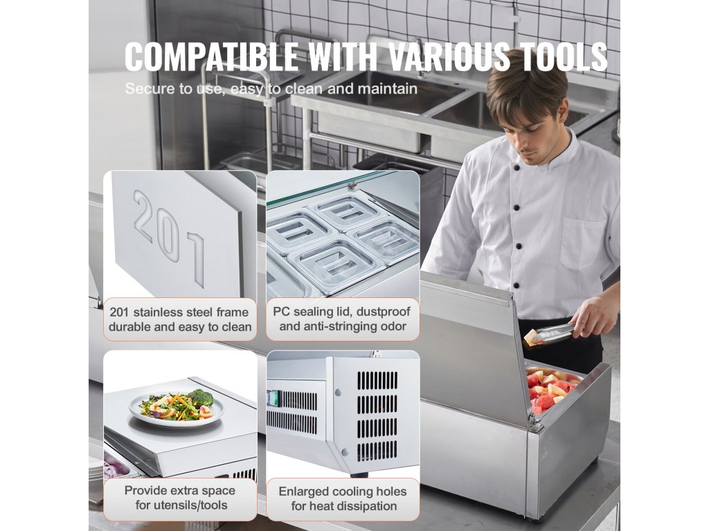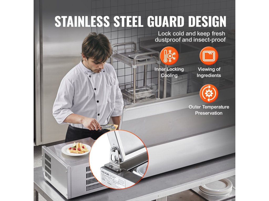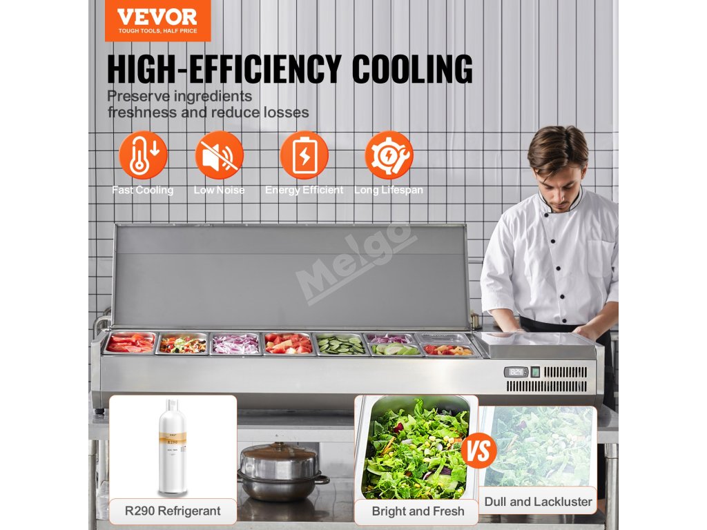 Trápí vás tyto problémy - obtížné udržování čerstvosti surovin, neúplné vystavení surovin a náročné čištění a údržba? Pultová chladicí stanice na přípravu koření VEVOR, určená pro komerční použití, optimalizuje uspořádání prostoru pro skladování různých čerstvých ingrediencí.