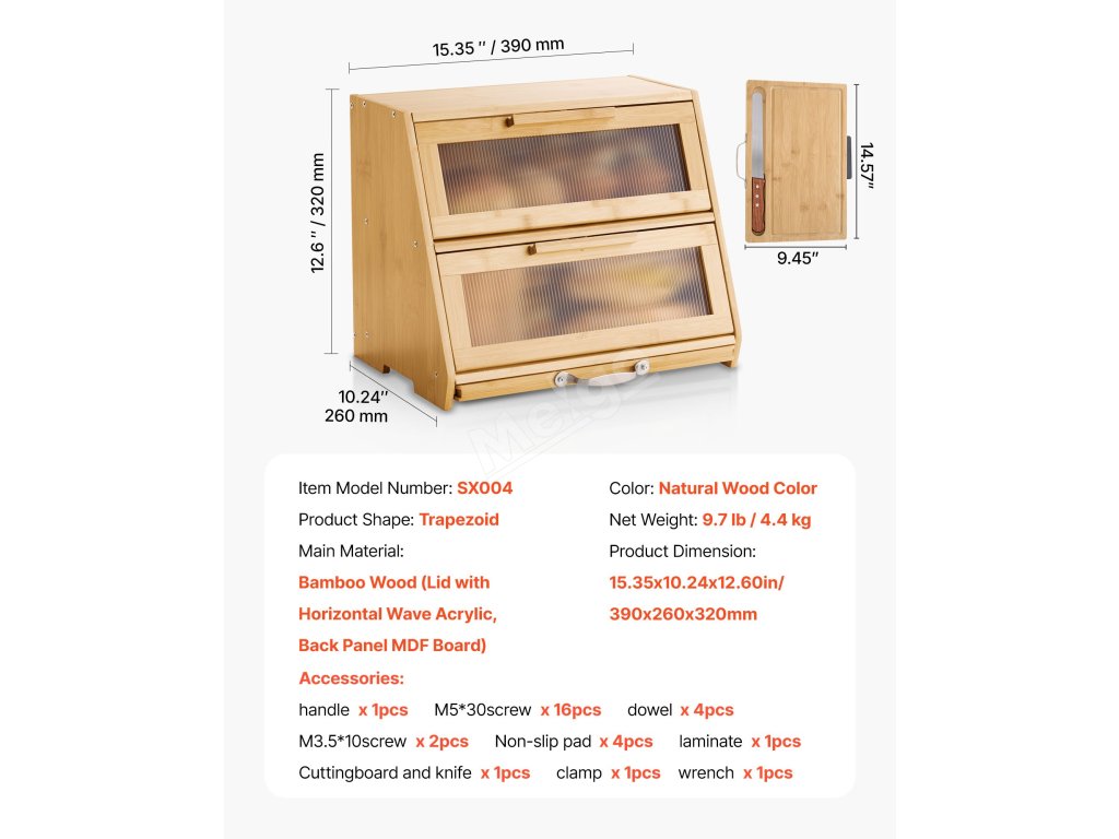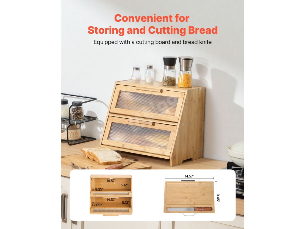 Bambusový zásobník na chléb obsahuje velkou přihrádku, do které se vejdou různé druhy chleba, a nůž na chléb a prkénko na krájení - není třeba hledat další nástroje.