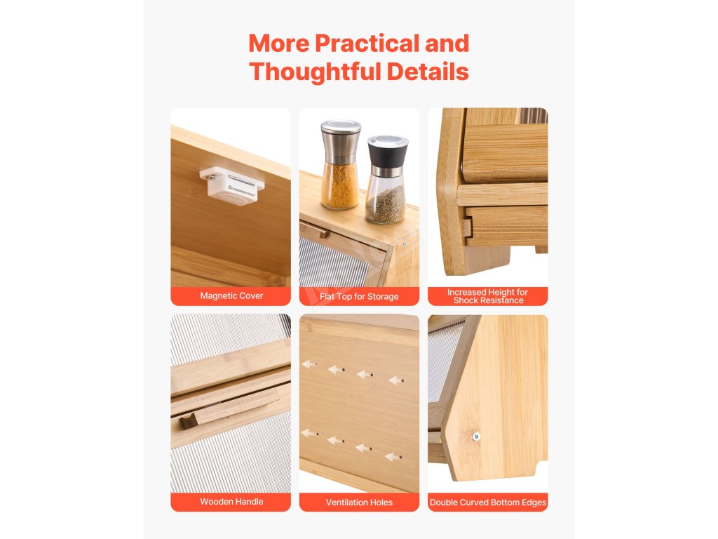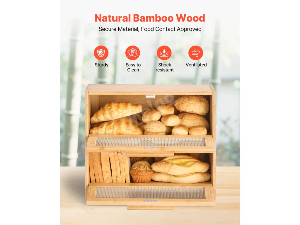 Tento dřevěný chlebník je vyroben z přírodního bambusu a je spolehlivý a odolný. Větrací otvory v zadní části zlepšují proudění vzduchu, což prodlužuje čerstvost chleba a udržuje ho déle chutný.