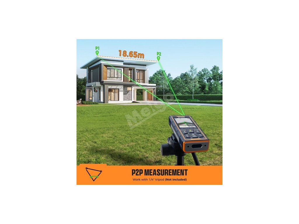 Vysoce přesný 360° senzor náklonu, kompatibilní se stativem (prodává se samostatně), umožňuje vzdálené měření vzdálenosti mezi libovolnými dvěma body pomocí technologie p2p. Vestavěná paměť uchovává až 100 sad dat pro pohodlný přístup.