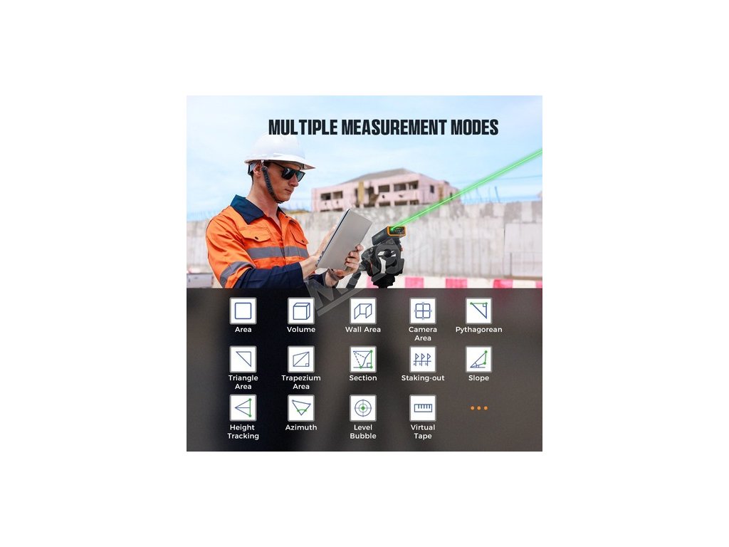 Tento laserový měřicí přístroj nabízí několik režimů měření, jako je měření plochy, objemu, trojúhelníkové věty, lichoběžníkové plochy, průřezu, sklonu, sledování výšky, azimutu a bublinkové vodováhy. Praktický virtuální metr je užitečný při renovaci domů a stavebních projektech.