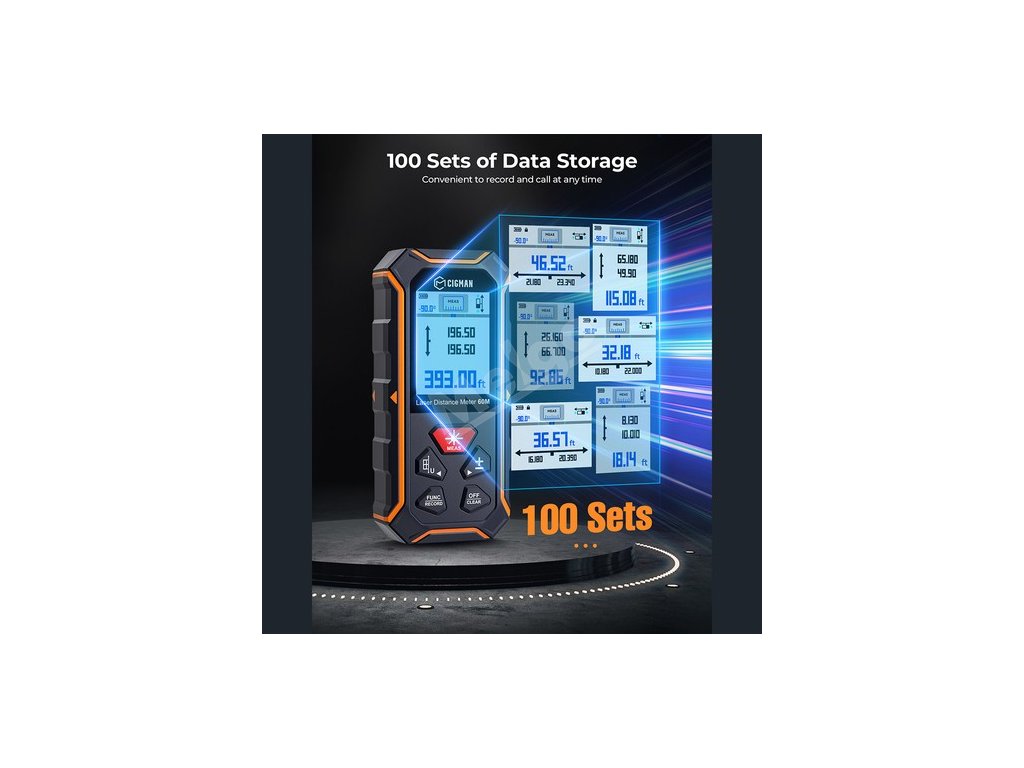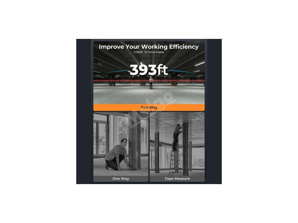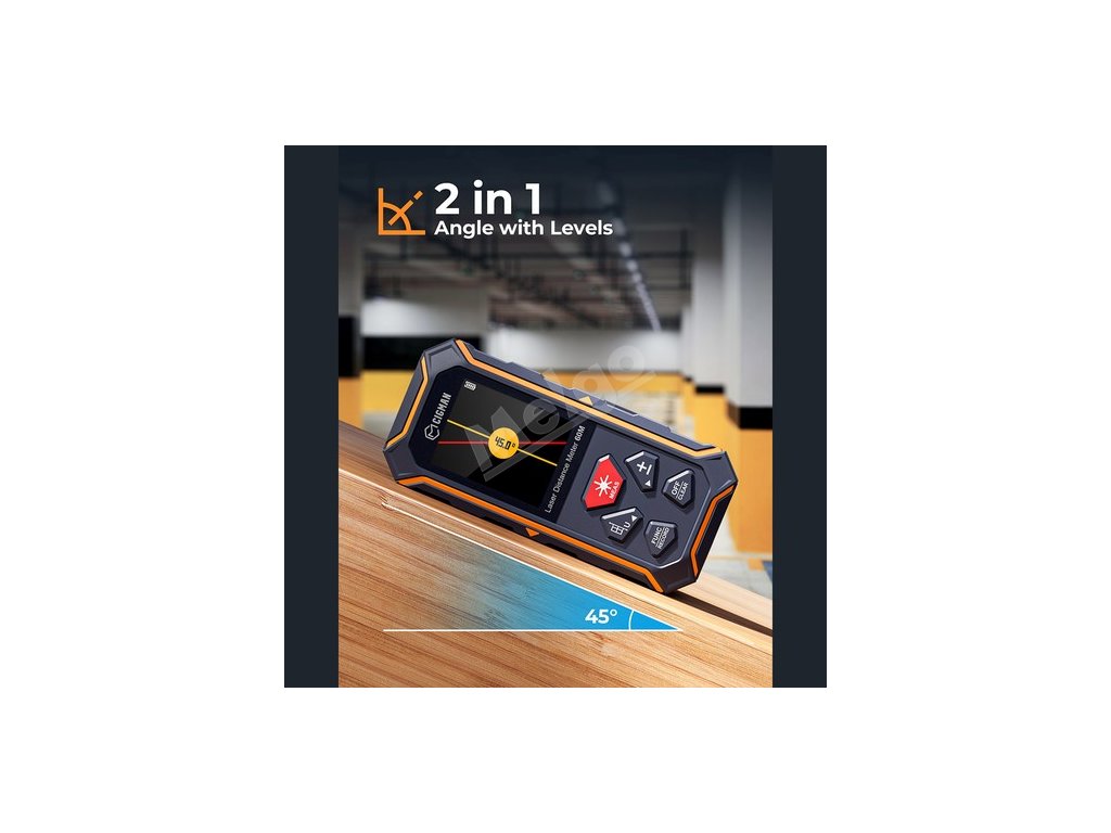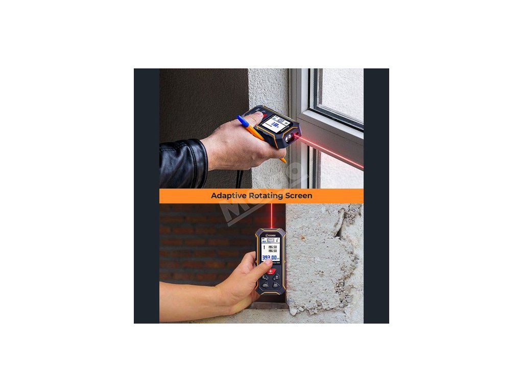 Tento laserový měřič vzdálenosti je vybaven velkým barevným podsvíceným displejem LCD, který je dobře viditelný i za jasného světla a v tmavém prostředí, a podporuje automatické otáčení a uzamčení ve 4 různých směrech pro snadné čtení naměřených dat; navíc elektronický úhlový senzor pomáhá rychle určit horizontální směr.