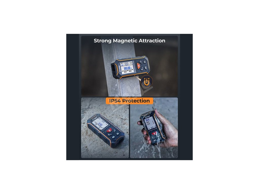 Duální laserový měřicí přístroj má jedinečnou konstrukci krytu a jeho tělo je obaleno materiálem ABS + TPE, který je odolný proti nárazu, protiskluzový a odolný proti pádu. Konstrukce je malá a kompaktní, což může uživatelům poskytnout lepší uchopení a pohodlí. Náš digitální měřič má také funkci zadního magnetického sání a vodotěsnost IP54, což je pohodlné pro přenášení a používání.