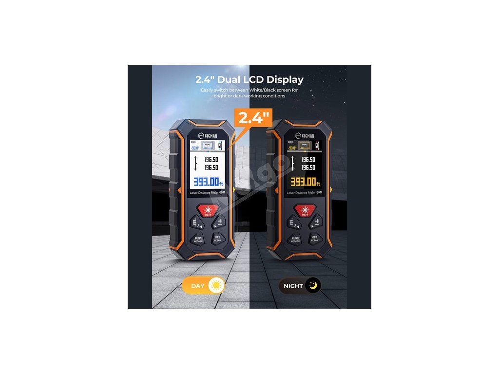 Nový duální laserový měřicí přístroj CD-60R od společnosti CIGMAN může přepínat mezi obousměrným a jednosměrným měřením. Maximální měřicí vzdálenost je 393 stop (120 m) s přesností +/-1/16 palce (2 mm) (jednosměrné dosahuje 196 stop až 60 m). Referenci měření lze nastavit tak, aby vyhovovala různým měřicím úlohám. Nemusíte často měnit polohu měřicího laseru, což výrazně zvyšuje efektivitu. Bezpečnostní laser třídy II, výstupní výkon 1 mW.