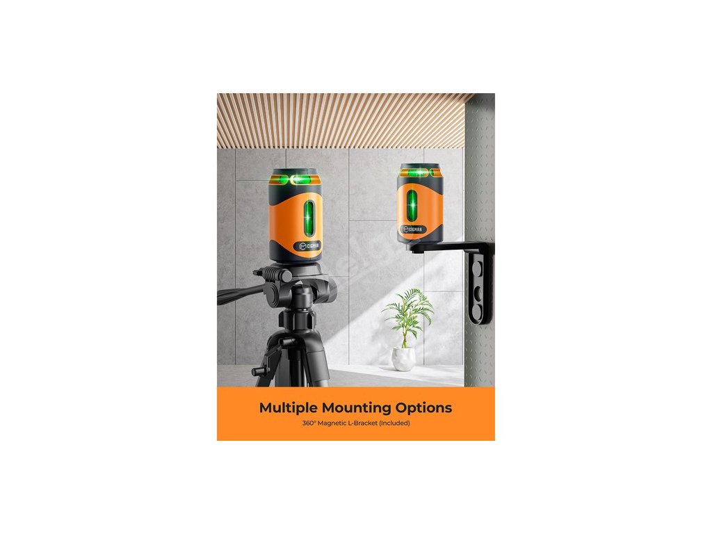 Laserová samonivelační vodováha CIGMAN je vybavena extrémně jasným 360° horizontálním a 180° vertikálním zeleným paprskem, který zajišťuje plné pokrytí vodováhy. Horizontální a vertikální linie 360° lze promítat samostatně nebo společně pro různé aplikace. Zelený laserový vodováha je 4x jasnější než červený paprsek, který může zajistit pracovní vzdálenost až 100 stop. Úroveň bezpečnosti - třída II, výstupní výkon 1 mW.