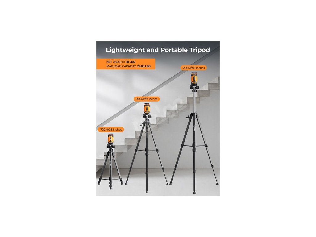 Laserová vodováha je dodávána se stativem s vodorovnou bublinou, kterou lze vysunout až na 48 palců, což vám pomůže nastavit polohu laseru pro maximální přesnost. Ve složeném stavu je vysoká 19 palců, takže se snadno skladuje. Dodává se se standardní 1/4palcovou rychloupínací destičkou, vhodnou pro standardní stativ nebo laserovou tyč, laserovou vodováhu lze instalovat a demontovat během několika sekund.
