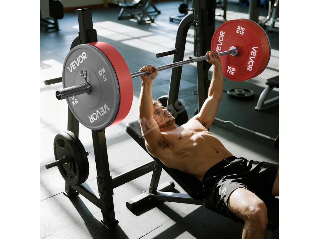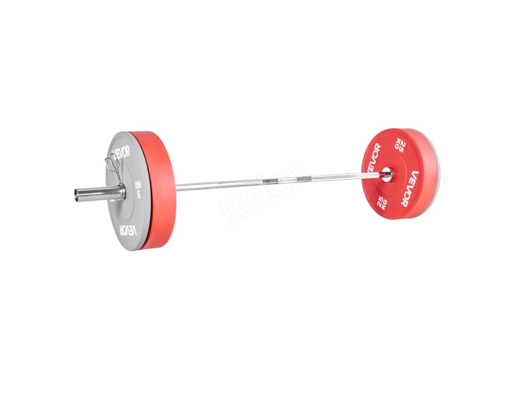 Tyč činky má přesné vroubkování a průměr úchopu 28 mm pro bezpečné a ergonomické držení. Konce s pojistnými kroužky udržují talíře pevně na místě a zajišťují stabilitu a bezpečnost při každém tréninku.