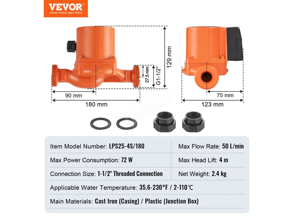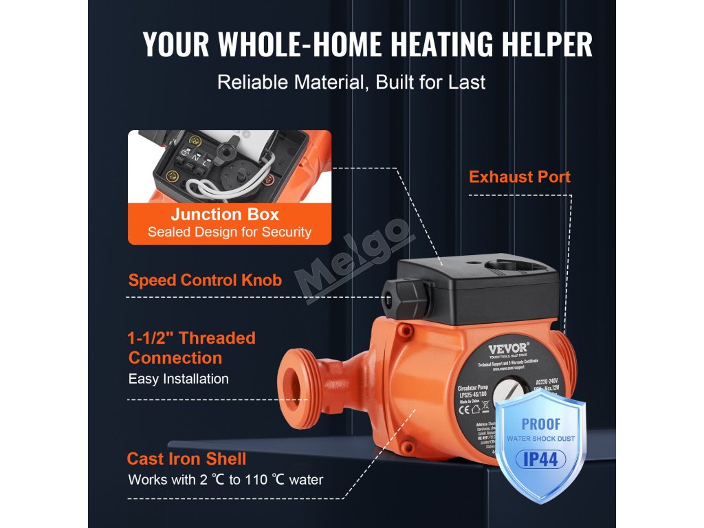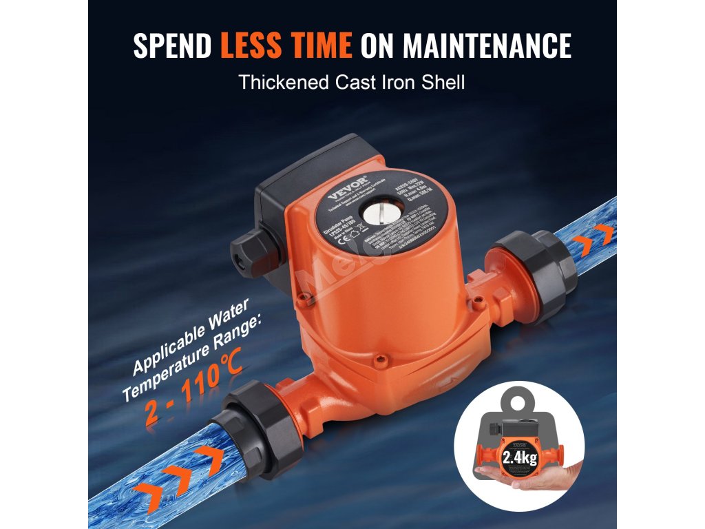 Toto oběhové čerpadlo teplé vody má dvě robustní gumová těsnění, která zabraňují únikům v místech připojení, chrání váš topný systém před poškozením vodou a pomáhají vám vyhnout se zbytečným opravám nebo plýtvání vodou.