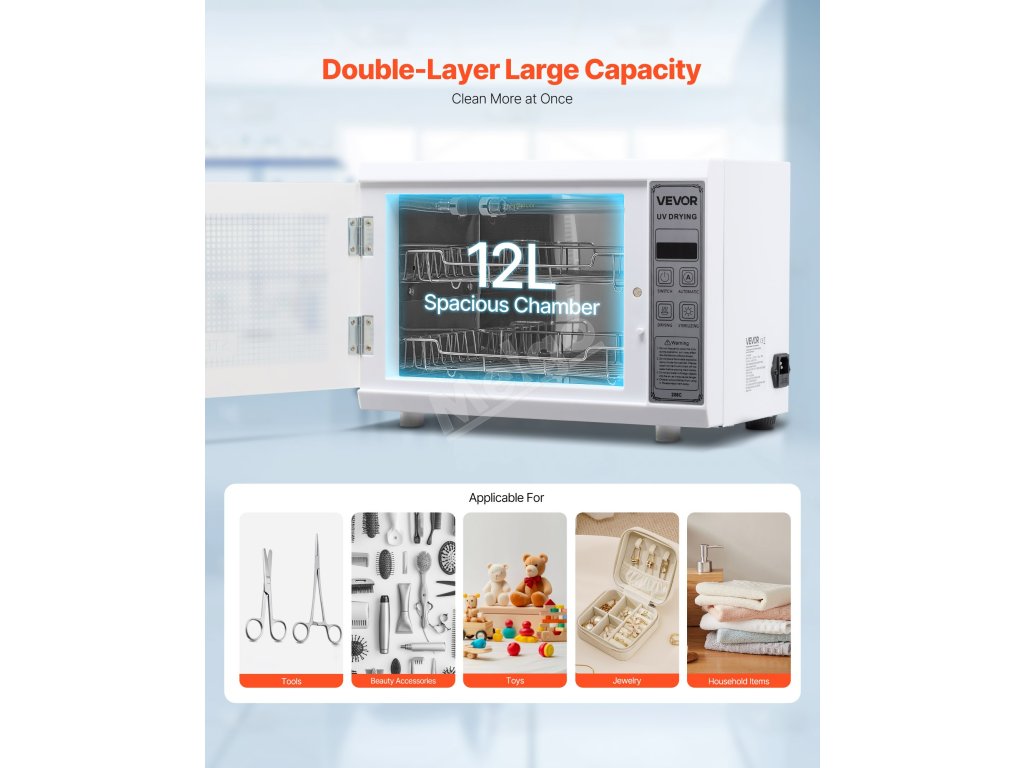 Tento multifunkčný stroj na čistenie nechtových nástrojov využíva UV svetlo s vlnovou dĺžkou 185 nm na účinné čistenie. Veľká kapacita 12 l s dvojvrstvovým dizajnom spĺňa potreby rodín, nechtových salónov, kozmetických salónov a ďalších. Viacero bezpečnostných funkcií zabezpečuje bezproblémové používanie.