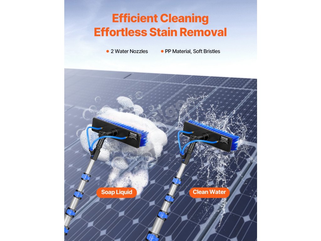 2 vodní trysky poskytují silný proud vody pro snadné čištění. Pro důkladnější čištění se jednoduše připojte k dávkovači mýdla a snadno se vypořádejte s odolnými skvrnami. Tato sada tyčového čističe napájená vodou, která je ideální pro lesklá okna, solární panely a další zařízení, umožňuje snadné a pohodlné čištění.