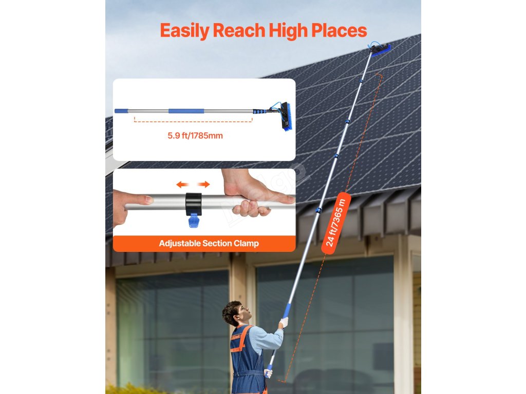 Čistící tyč na solární panely 7.3m, výsuvný, 180° kartáč, 20m hadice