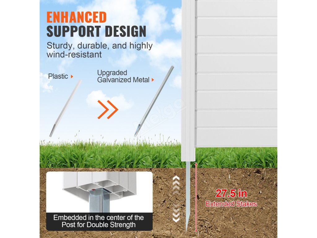 Standardní plastové kolíky jsme nahradili pozinkovanými kovovými. Jsou prodlouženy na 27,5 palce pro hluboké ukotvení v půdě a posilují stabilitu vinylového plotového panelu. Začlenění kovových nohou do sloupků snižuje přímé poškození při silném dešti nebo bouřce.