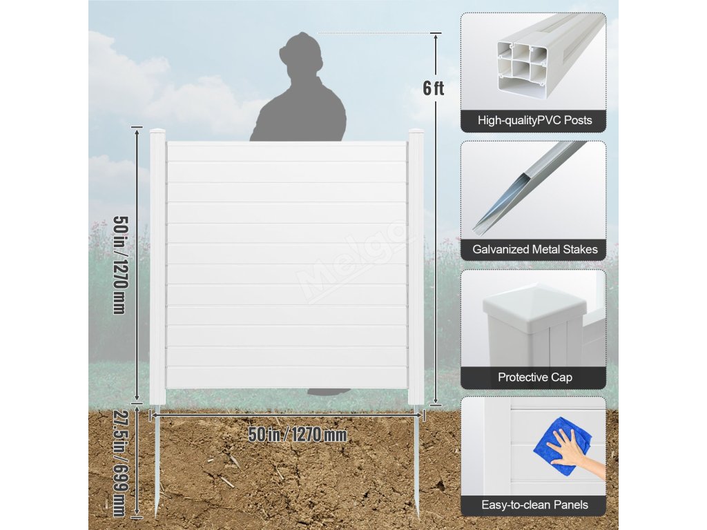 Náš 2panelový plot z PVC s odolnými pozinkovanými kovovými sloupky zajišťuje dlouhotrvající venkovní použití. Velikost 50 "x50" nabízí univerzální možnosti oplocení venkovních objektů nebo soukromých prostor. Dodává se s veškerým potřebným příslušenstvím a podrobným návodem, což je ideální pro pozvednutí vzhledu vašeho dvora.