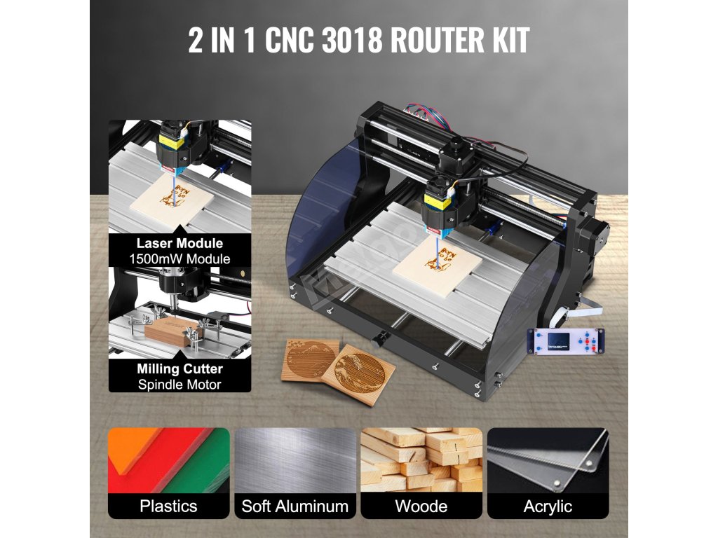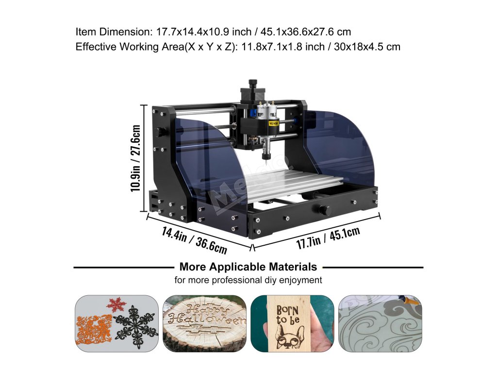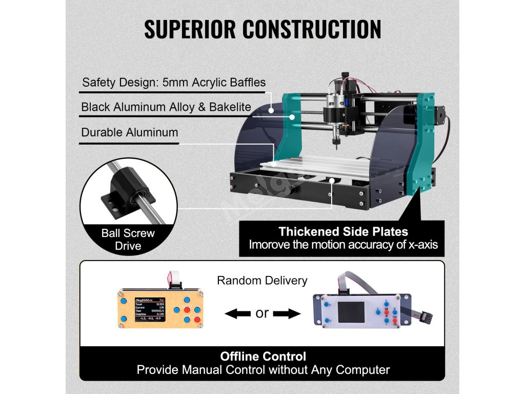 Tento CNC gravírovací stroj s efektivní pracovní plochou 11,8 (X)x7,1 (Y)x1,8 (Z) palce je vyroben z hliníku. Je vybaven kompletním příslušenstvím, které vám umožní efektivní práci. Je ideálním nástrojem pro gravírování všech typů plastů, měkkého hliníku, dřeva, PVC atd. a představuje vynikající cenově dostupný nástroj pro gravírování pro samouky.