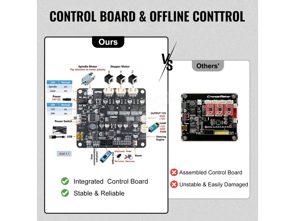 Laserový modul s výkonem 15 000 mW a stejnosměrný vřetenový motor s osou Z 775 dosahují vysokých rychlostí. Na třech osách jsou tři krokové motory pro plynulý pohyb.