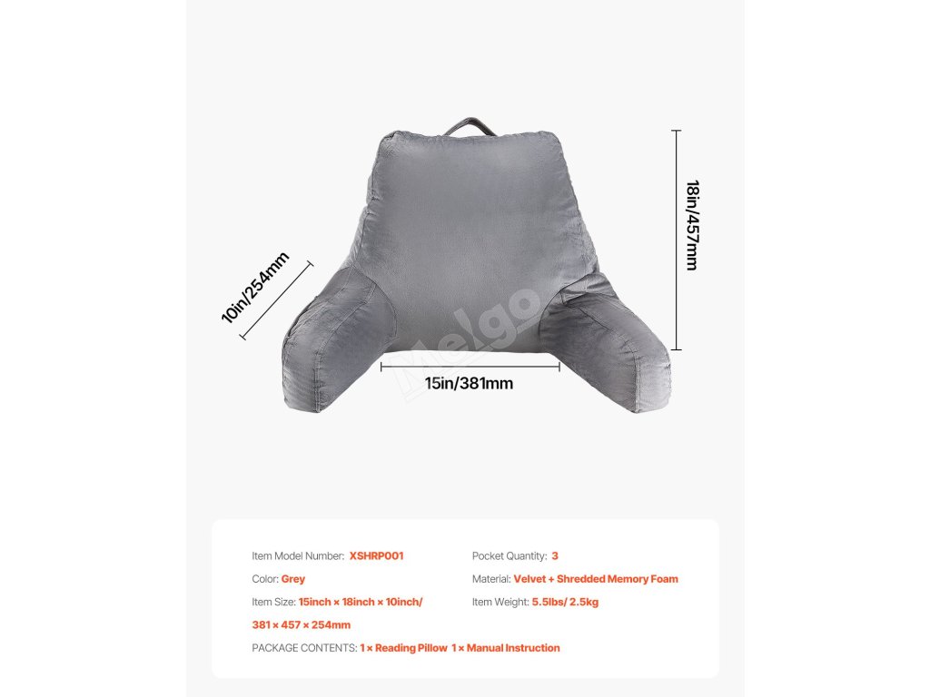 Čtenářský polštář standardní s drcenou paměťovou pěnou, 3 kapsy, šedý