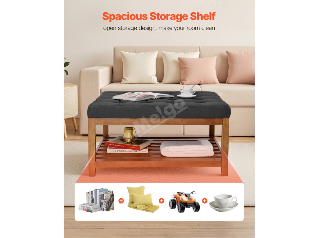 Otevřený úložný prostor usnadňuje ukládání často používaných předmětů, jako jsou svačiny, dálkové ovladače, časopisy a hračky. Pomáhá udržovat pořádek a organizaci v obývacím pokoji a zabraňuje nepořádku na pohovce a konferenčním stolku.