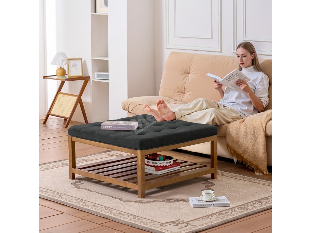 Kombinuje úložný prostor, podnožku, sedadlo a stolek a unese až 400 kg. Prodyšná lněná tkanina a silný pěnový polštář poskytují pohodlí a odolnost. Spodní dřevěný úložný prostor pro snadný přístup k hračkám, dálkovým ovladačům a dalším věcem. Ideální pro malé prostory.