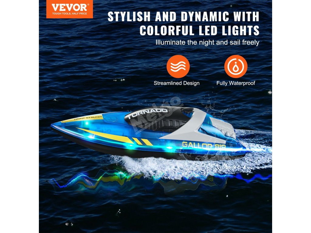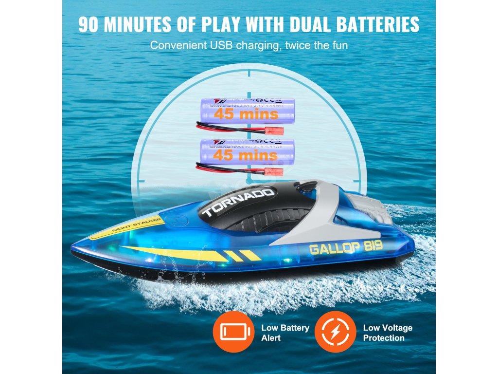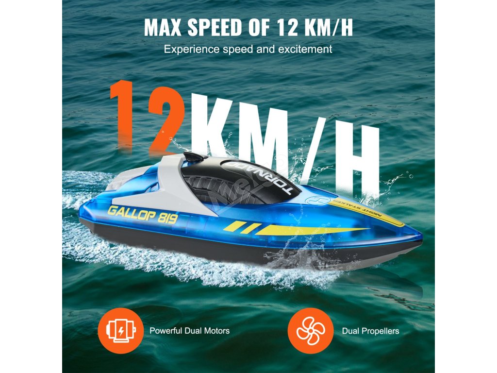 Díky dvěma motorům a lodním šroubům má tento dálkově ovládaný člun silný a stabilní výkon a dosahuje rychlosti až 12 km/h. Je ideální pro zvýšení vzrušení a zábavy při jakékoli vodní aktivitě.