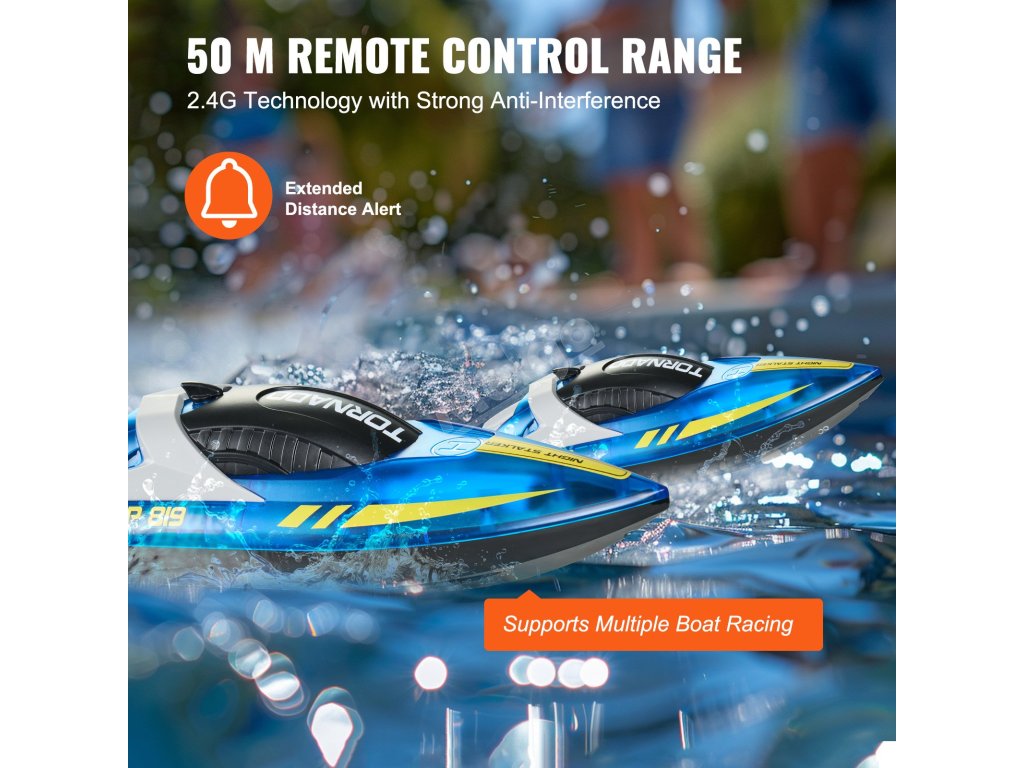 Člun na dálkové ovládání je vybaven technologií 2.4G pro bezproblémové ovládání až do vzdálenosti 164 stop/50 m. Skvěle se hodí pro závody více lodí a obsahuje upozornění na dosah, aby byla loď bezpečně v dosahu.