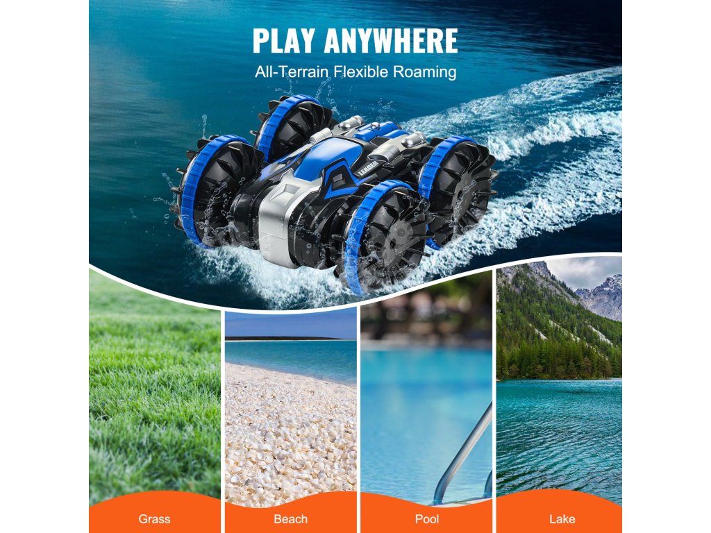 Toto obojživelné auto je vyrobeno z odolného materiálu ABS a je plně vodotěsné, takže je připraveno přijmout jakoukoli výzvu, ať už si hrajete na vodě nebo na souši. Je zkonstruováno tak, aby jelo bez ohledu na to, co se mu postaví do cesty.