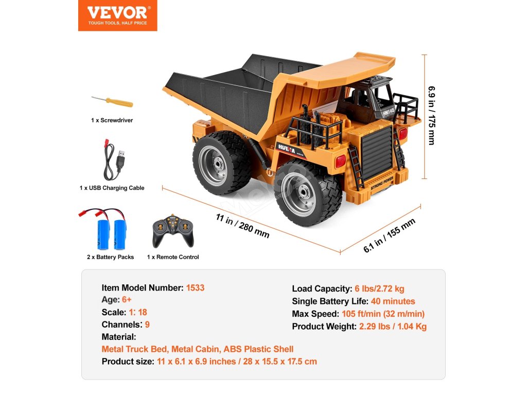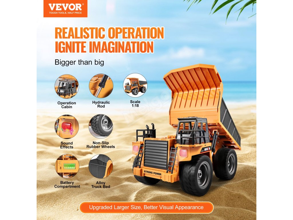 Zažijte vzrušení z reálného provozu s tímto RC sklápěčem! Díky funkcím, které se ovládají jedním dotykem, jako je lože nákladního vozu, prostor pro baterii a simulovaná hydraulická tyč, působí jako skutečný. Zvukové efekty a protiskluzová gumová kola ještě umocňují zábavu!