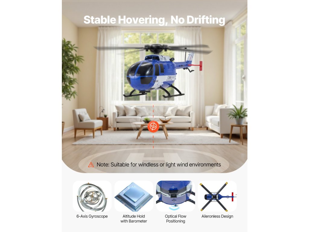 Toto rc letadlo je vybaveno pokročilým systémem řízení letu včetně udržování výšky, optického polohování toku a šestiosého gyroskopu, který usnadňuje ovládání polohy letu a zpřístupňuje řadu zábavných letových režimů.