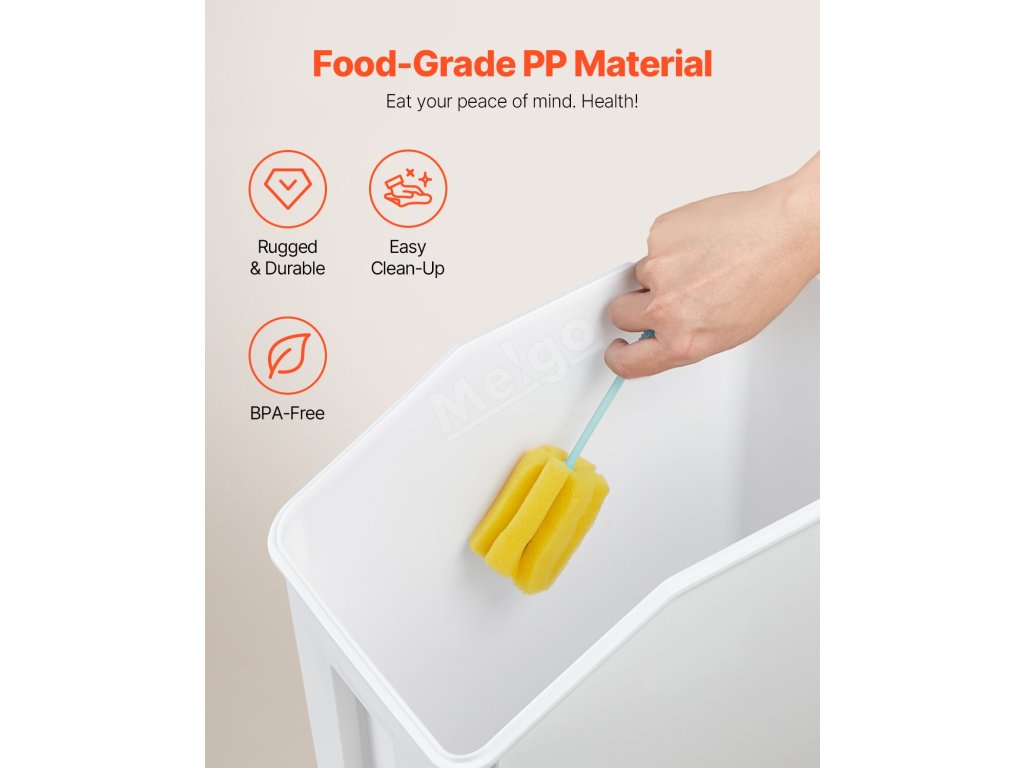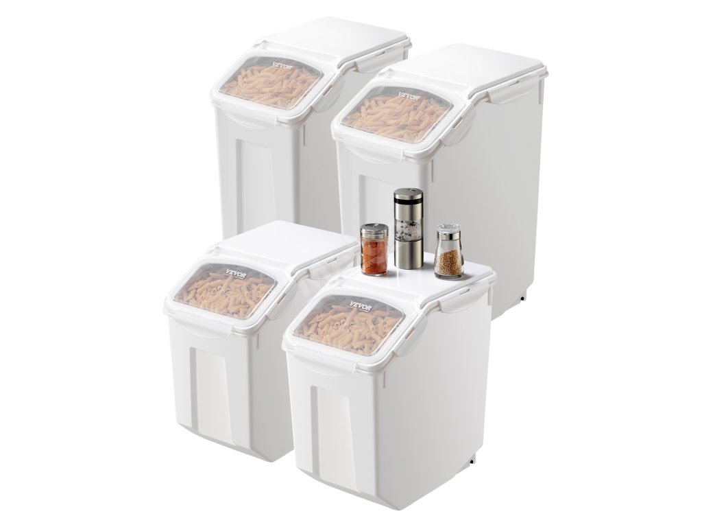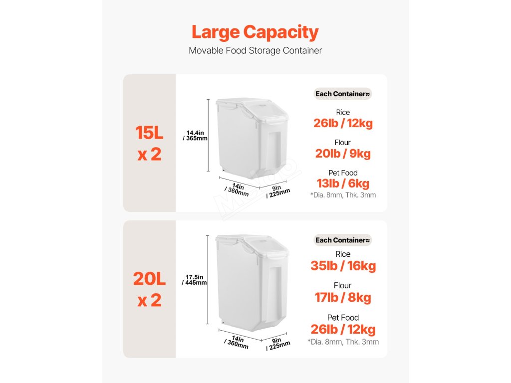 V závislosti na typu a hmotnosti suchého zboží se do 15litrové nádoby vejde až 26 kg rýže nebo 13 kg krmiva pro domácí zvířata; do 20litrové nádoby se vejde až 35 kg rýže nebo 17 kg krmiva pro domácí zvířata. Její stohovatelná konstrukce vám umožní uspořádat si úložný prostor.