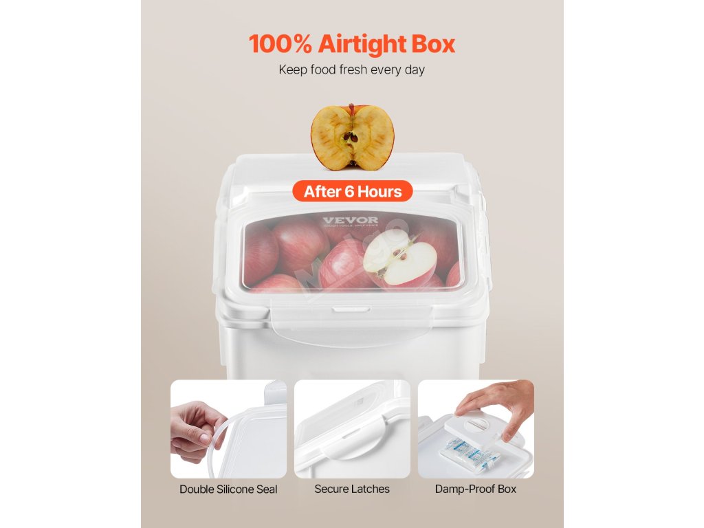 Kuchyňský zásobník na ingredience obsahuje těsnicí spony, 2 silikonové těsnicí kroužky a sušící box, který zajistí, že potraviny zůstanou suché.