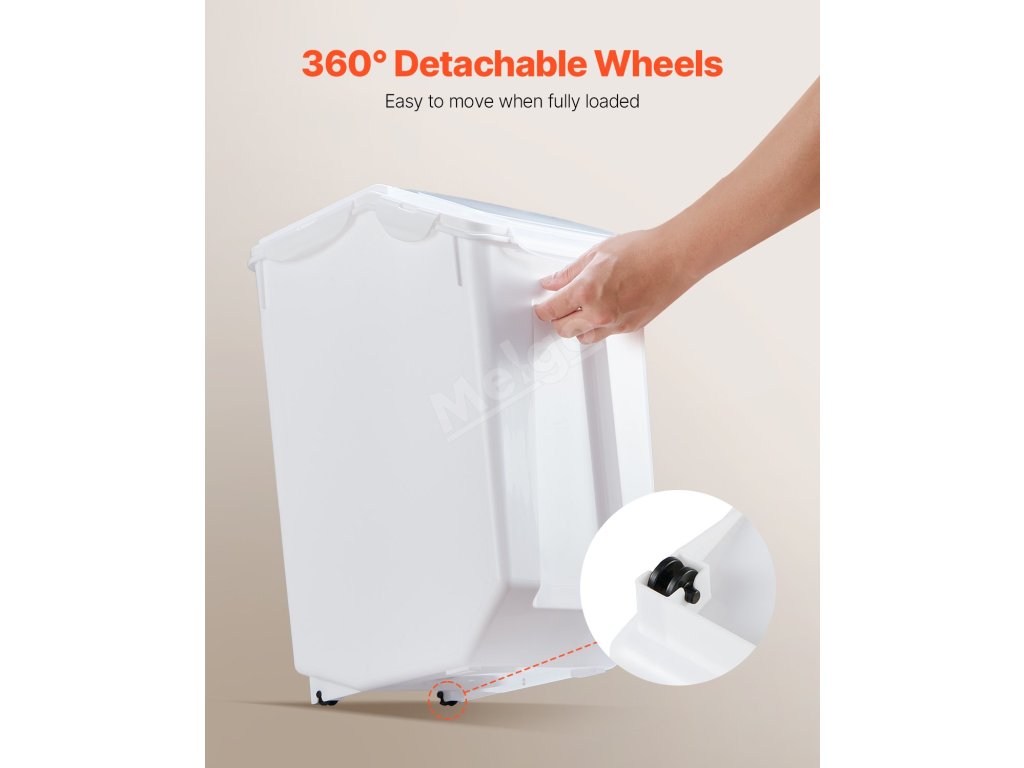 Tento kontejner na krmivo pro domácí zvířata je vybaven kolečky odnímatelnými o 360°, která zajišťují snadný pohyb i při plném naložení. Ať už převážíte těžké krmivo pro domácí mazlíčky nebo sypké suché zboží, přesun po kuchyni nebo skladovacích prostorách je bezproblémový a pohodlný.