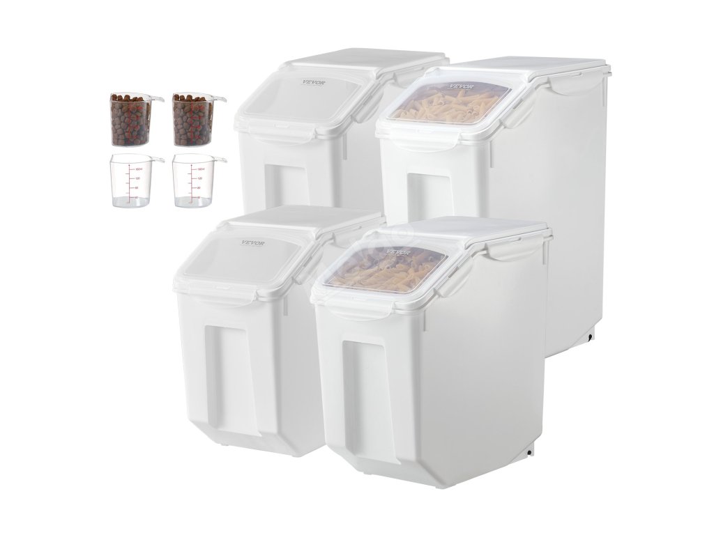 Dávkovač krmiva 2×15L + 2×20L, vzduchotěsný, kolečka, 4 odměrky