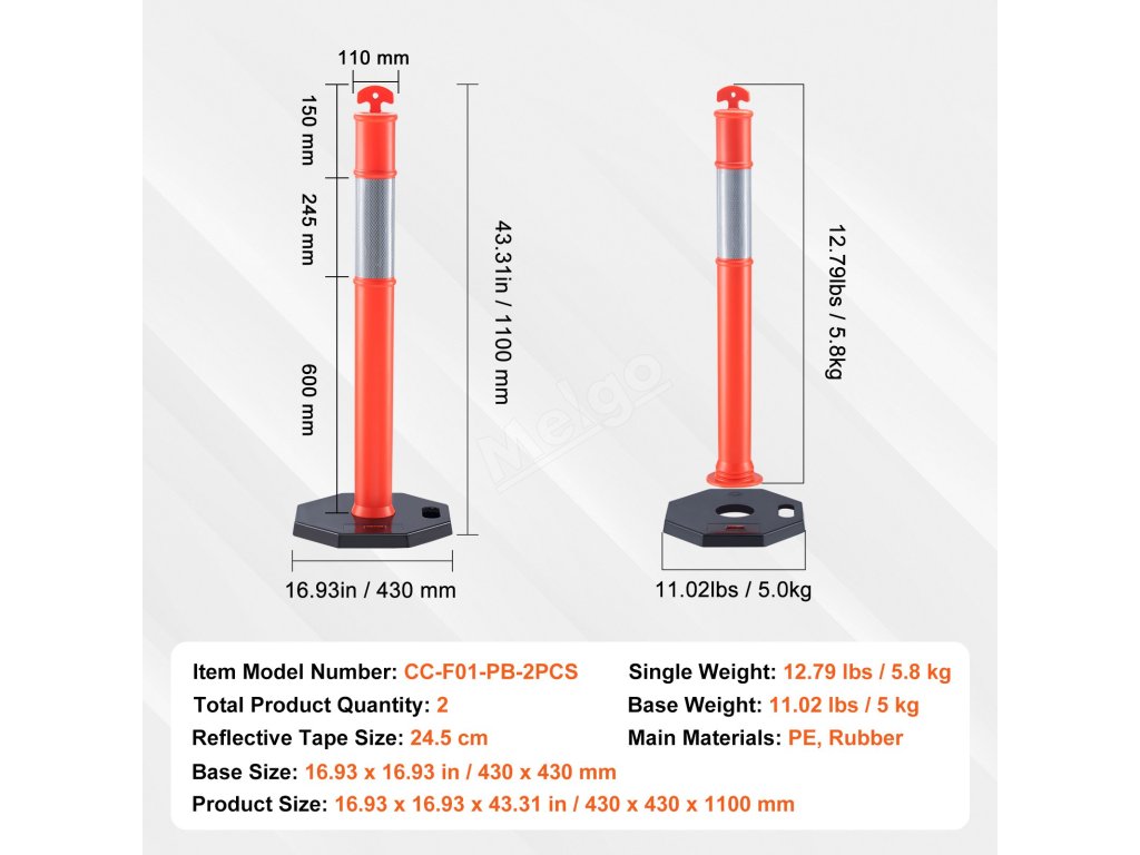 Naše vymezovací kužely mají prodlouženou osmihrannou pryžovou základnu o rozměrech 16,93 x 16,93 palce a hmotnosti 11,02 kg, která zajišťuje dostatečnou stabilitu odolávající vnějším silám a zvyšuje účinnost výstrahy.