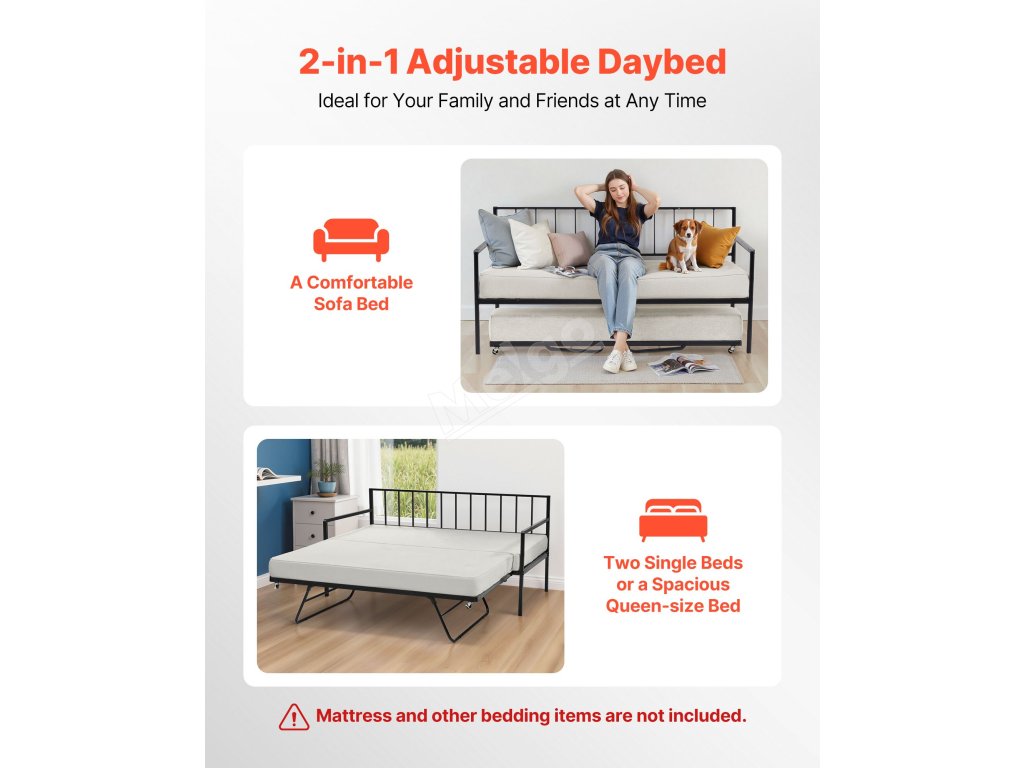 Toto dvouúčelové denní lůžko lze jednoduchým vysunutím a zvednutím přeměnit na pohodlné lůžko, které poskytuje další spací plochu pro hosty a zároveň maximalizuje prostor a poskytuje pohodlí pro každodenní použití.