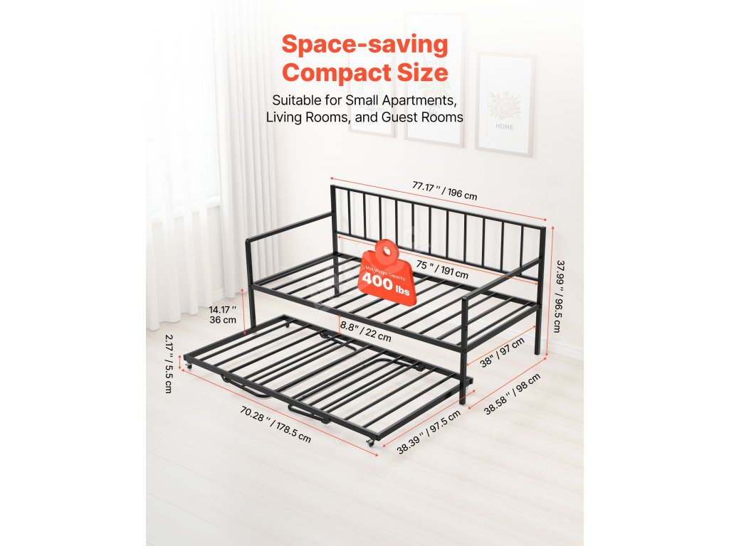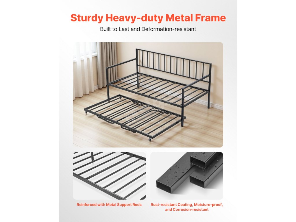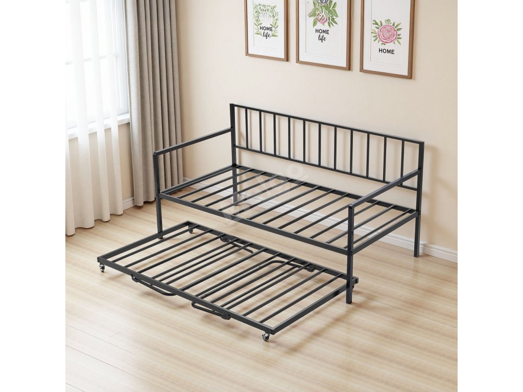 Tato kovová denní postel je navržena s ohledem na bezpečnost a má zaoblené područky, kovový rám odolný proti korozi a zesílené protiskluzové nožky, které zajišťují výjimečnou stabilitu při každodenním používání.