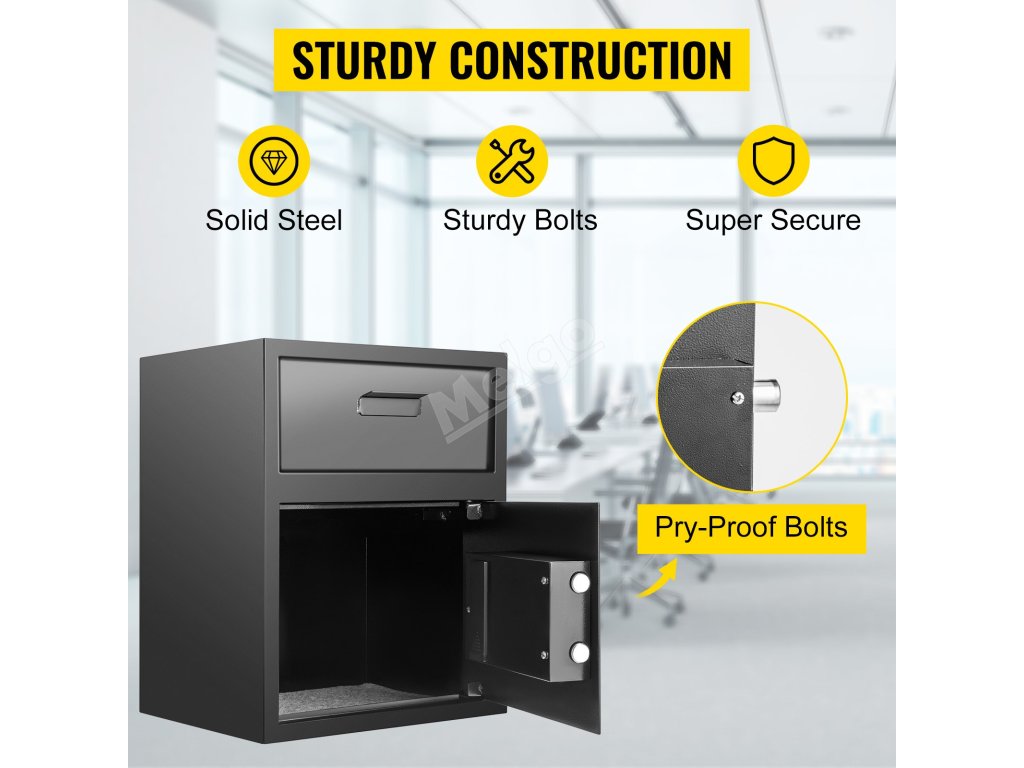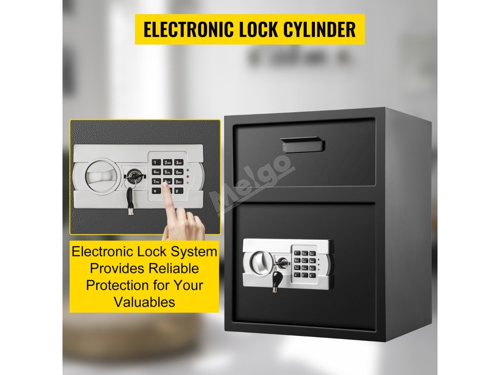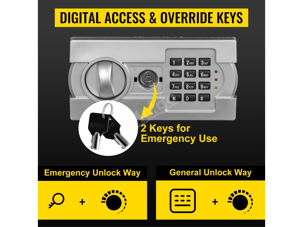 V této bezpečnostní schránce je použit elektronický kódový zámek, který je bezpečnější než mechanický zámek. Dodává se se dvěma klíči pro případ zapomenutí hesla nebo nedostatku energie.