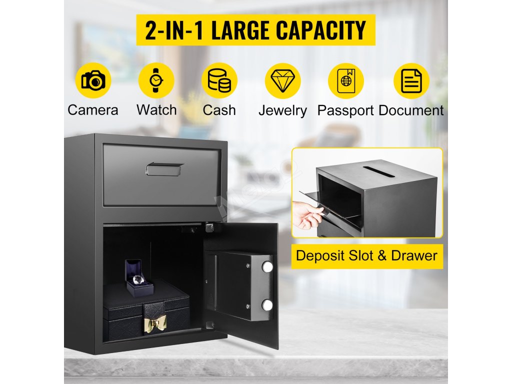 Skříňka obsahuje dva nezávislé trezory. Vkladový otvor, který umožňuje pohodlné uložení hotovosti a dokumentů. Vkladová zásuvka je umístěna v přední části a funguje jako poštovní schránka.