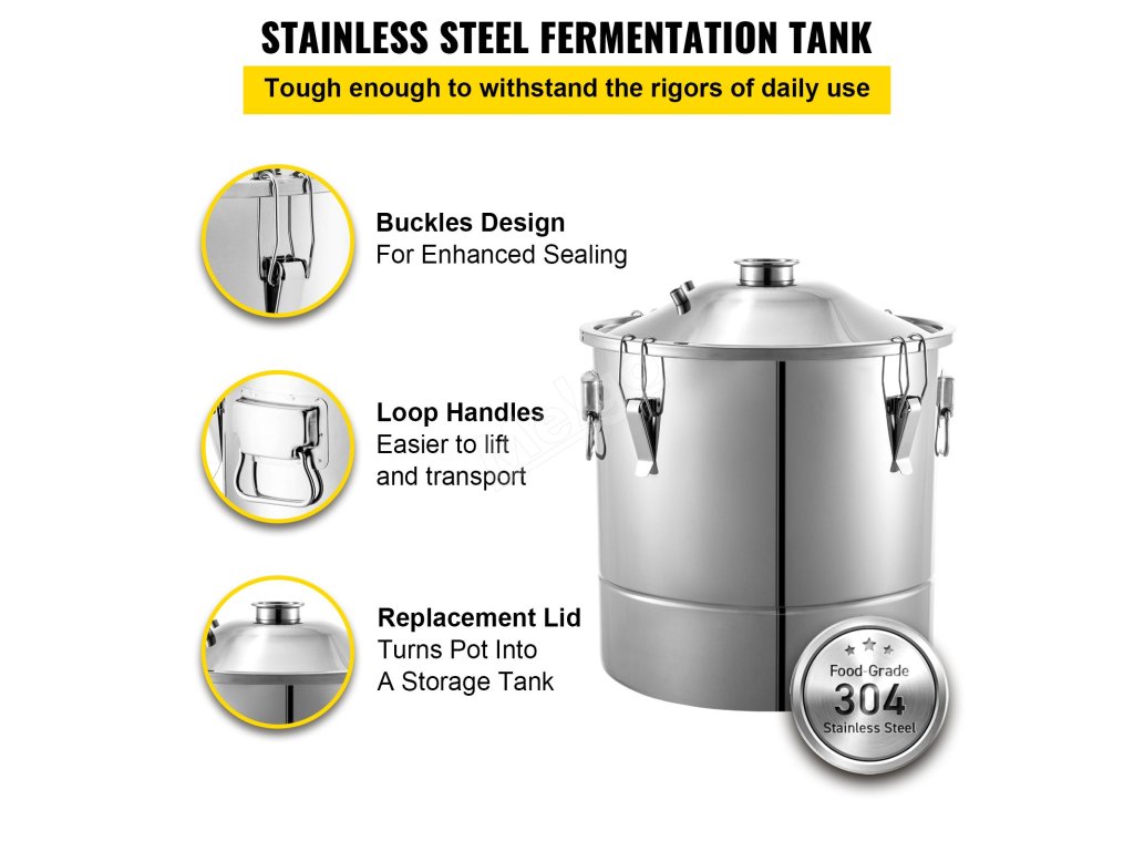 Díky vybranému materiálu z potravinářské nerezové oceli má naše palírna velký objem 30 l / 6,6 UK Gal. Její rukojeti s poutky usnadňují zvedání a přezky jsou navrženy pro lepší těsnění.