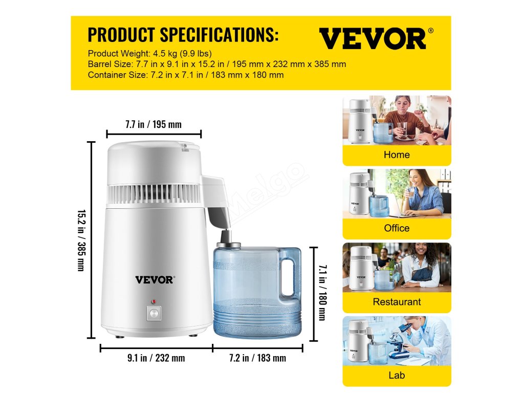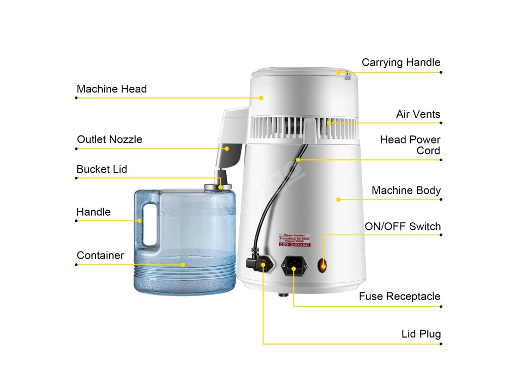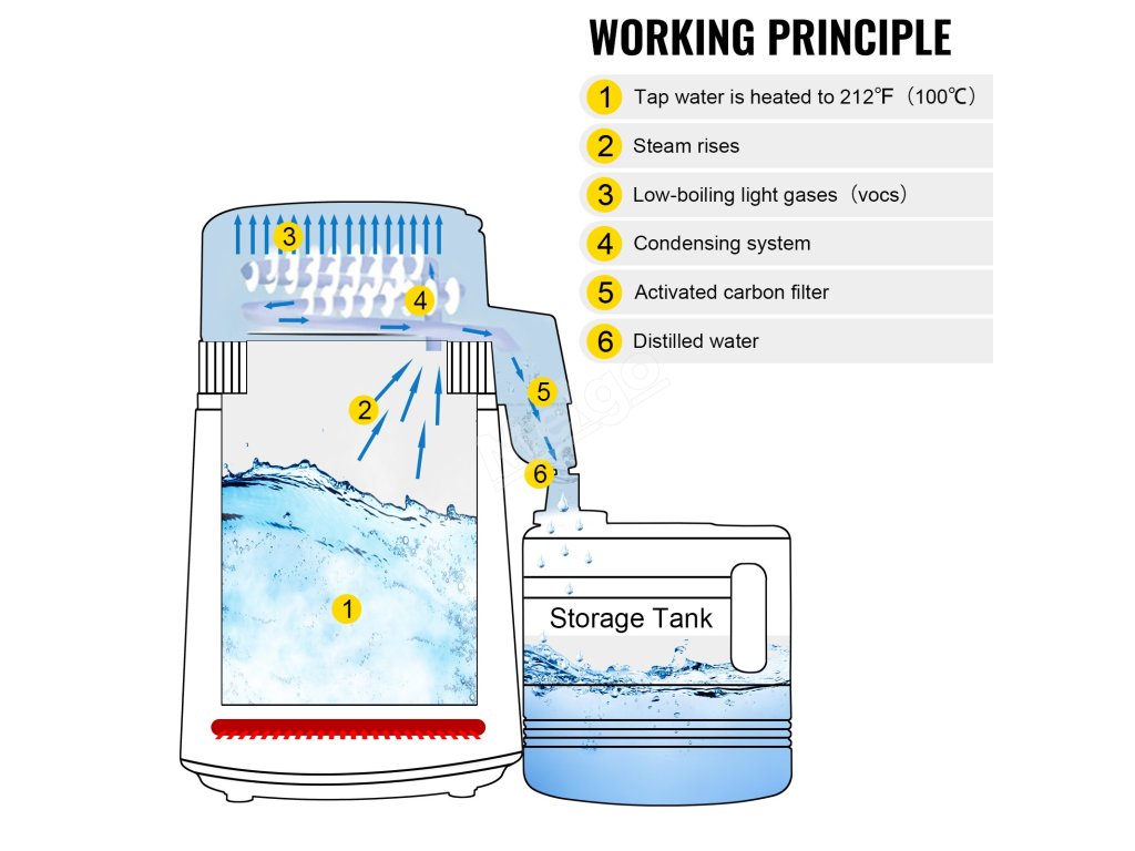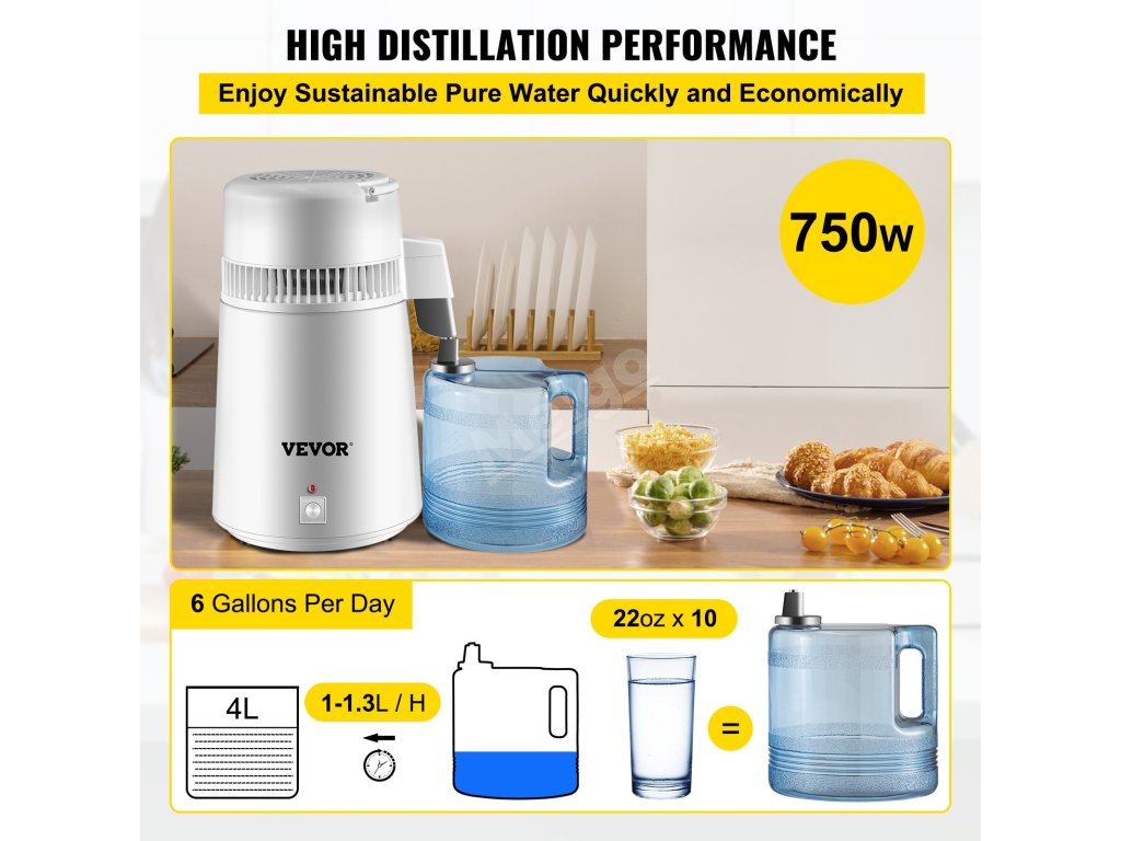 Destilační přístroj o výkonu 750 W dokáže odstranit většinu nečistot z kohoutkové vody, jako jsou těkavé organické látky, rozpuštěné pevné látky a téměř všechny ostatní nečistoty, rychlostí více než 0,34 gal/1,3 l za hodinu. Za den dokáže vydestilovat celkem 8,24 gal/31,2 l. Aby nedošlo k ovlivnění chuti vody, doporučujeme jednou týdně vyměnit sadu uhlíkových filtrů.