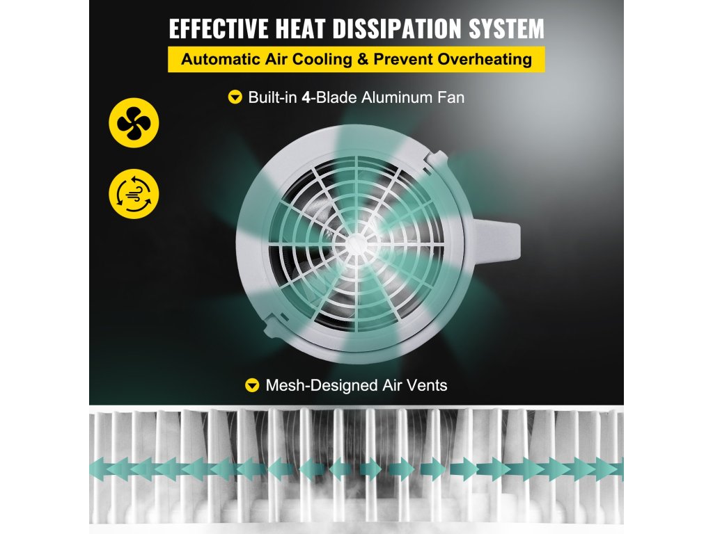Ventilátor se čtyřmi lopatkami na horním krytu vodního destilátoru používá hliníkový materiál namísto křehkého plastu a také výfukový uzávěr byl změněn z plastu na nerezovou ocel 304. Tím je zajištěn dobrý odvod tepla a dlouhá životnost.