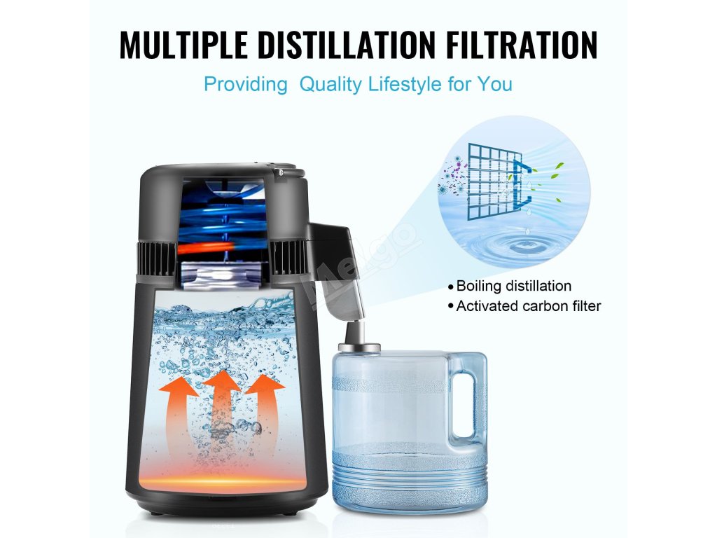 Destilací a dvojitou filtrací s aktivním uhlím odstraňuje většinu nečistot z kohoutkové vody, jako jsou těkavé organické látky, rozpuštěné pevné látky a téměř všechny další kontaminanty, a poskytuje tak čistou a zdravou pitnou vodu.