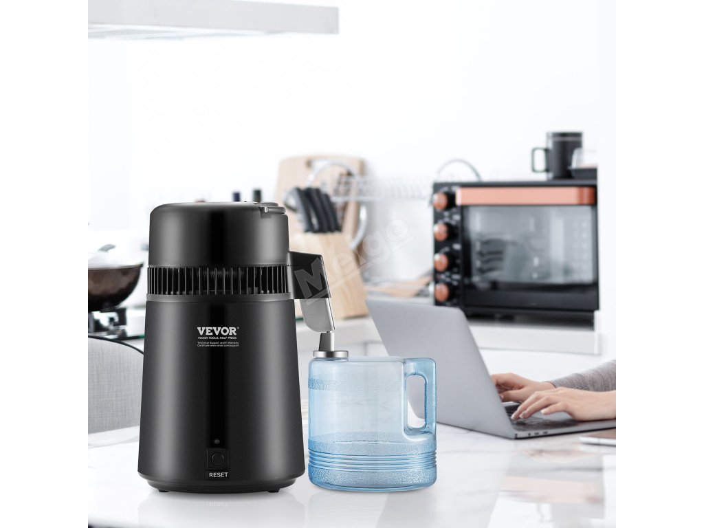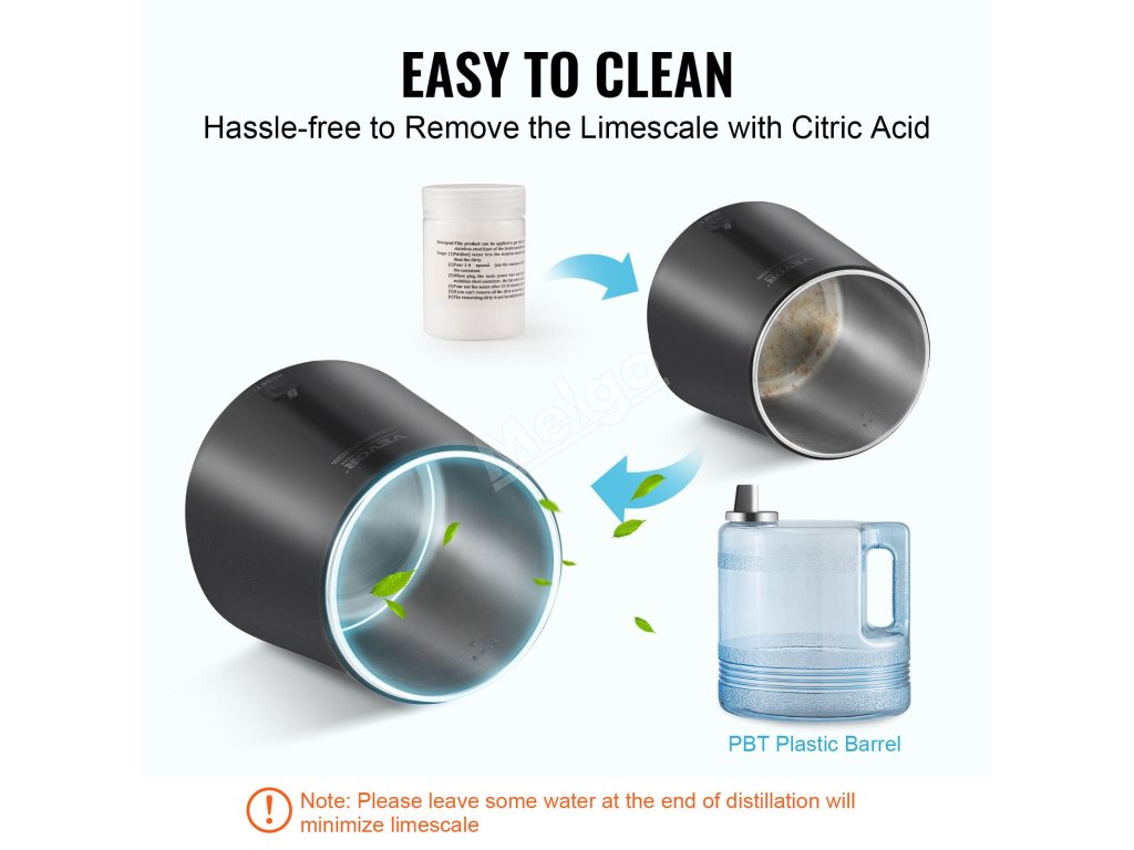 Destilační přístroj o příkonu 750 W vyrobí více než 0,26 GAL/1L vody za hodinu a jeho destilační kapacita je 6,3 GAL/24L za den. Je vyroben z potravinářské nerezové oceli 304, chrání vaše zdraví a zajišťuje stálý přísun destilované vody.